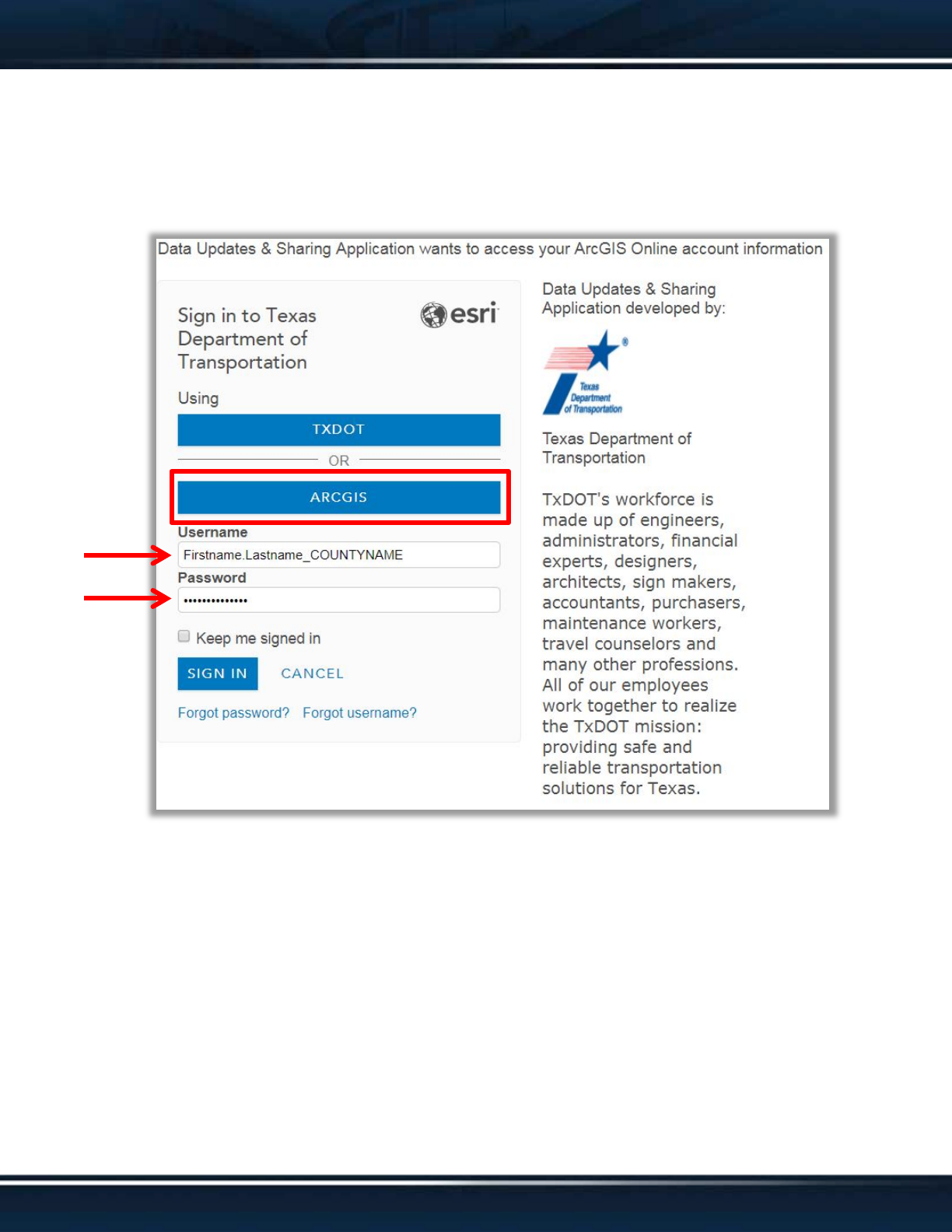 with your new ArcGIS Online username and password. DO NOT attempt to sign-