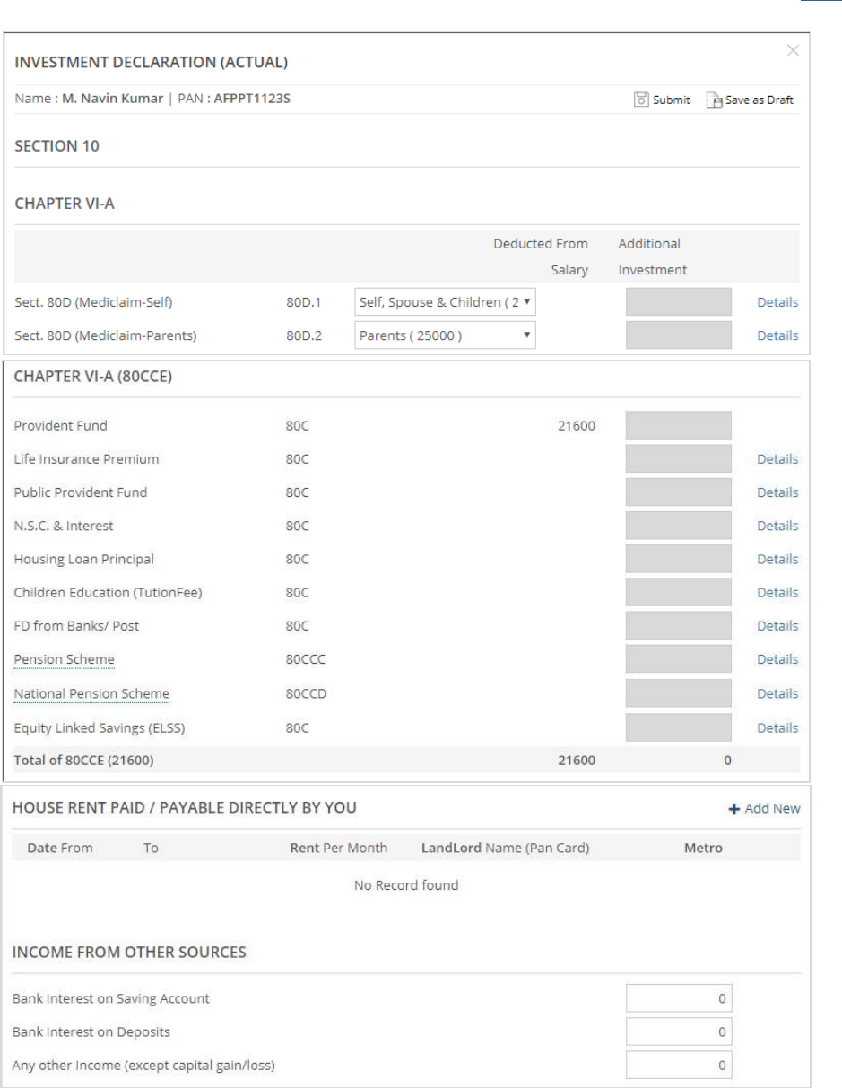 Under Section VI A, below fields are available for the investment declaration. User can enter the