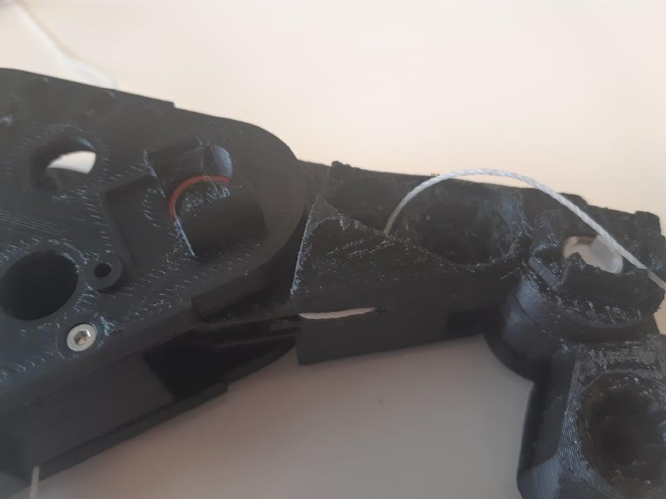 From the wheel, to the MCP joint, the tendon is in crossed configuration. Route them around the last