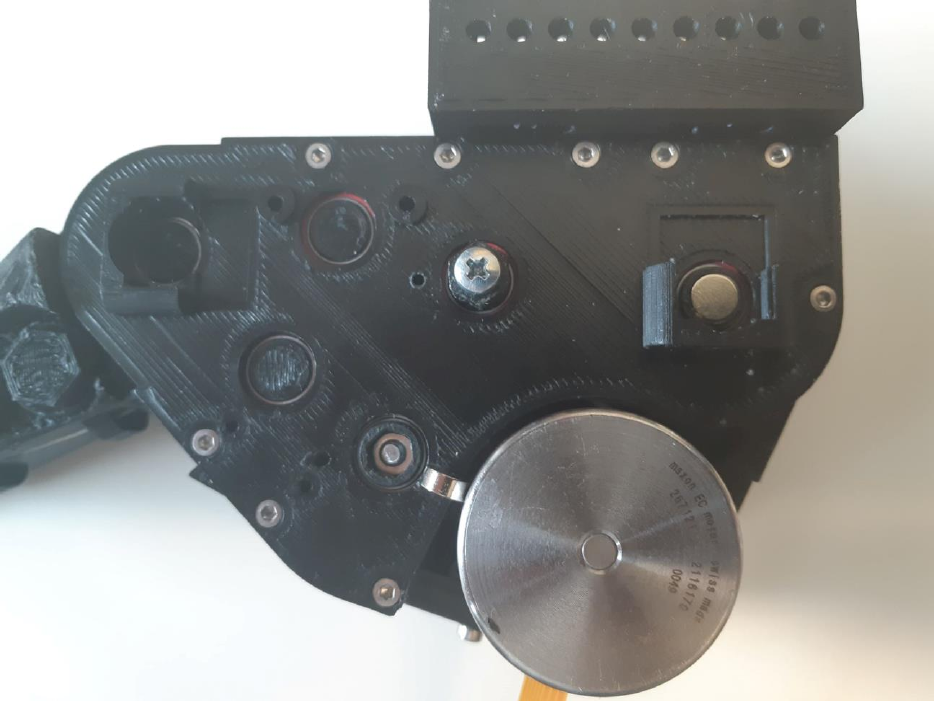 The frontplate is attached, and the blackplate is removed, revealing the the gearbox from the oposite