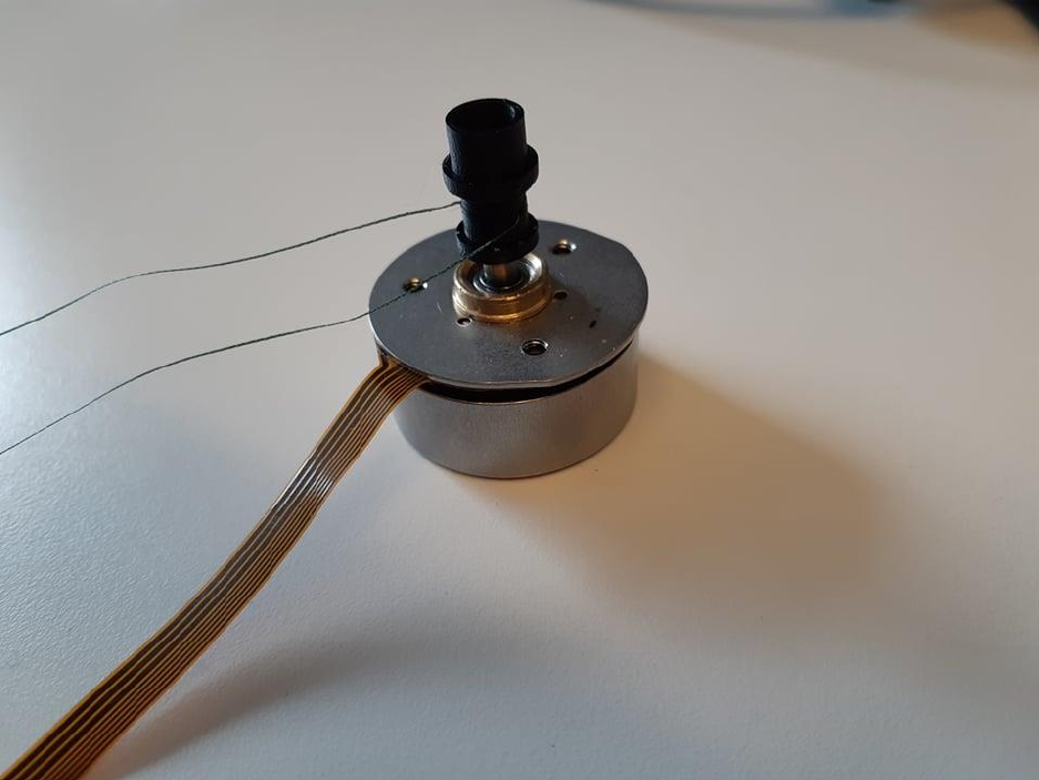 In the same way as with the previous motor: One side of the string is wound 8 times around the motor