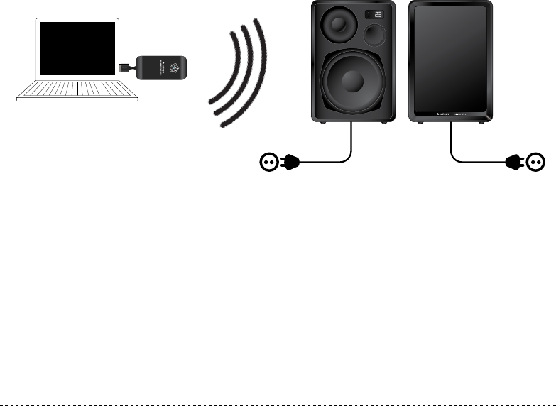 LED lyser blått på både högtalare och sändare när trådlös länk är upprättad.