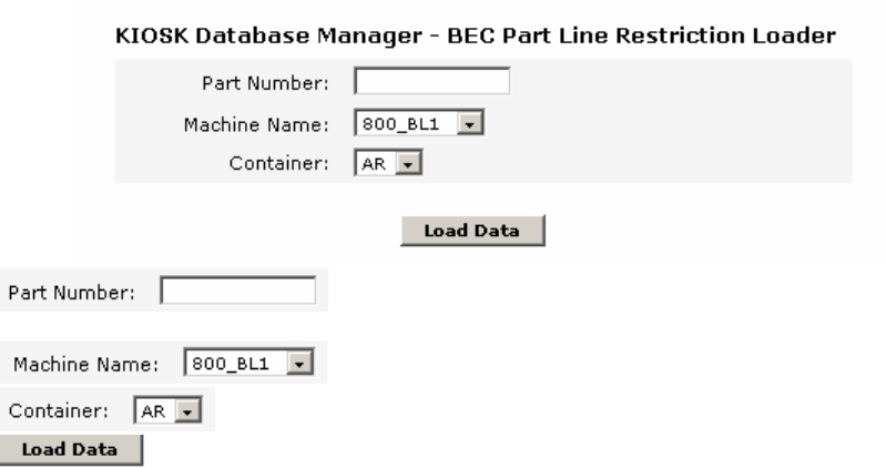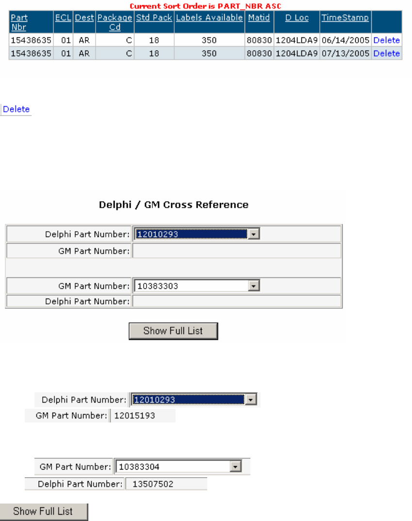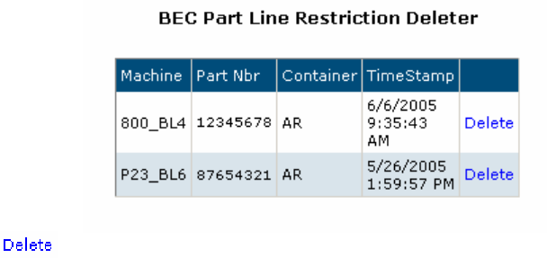 Deleter Page. This page is used to delete the restriction for a Part Number from a Machine.