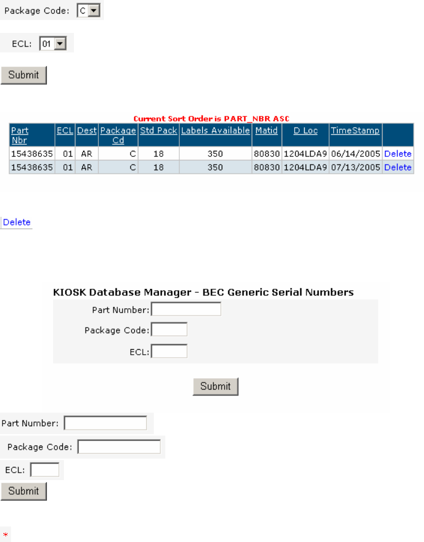 Page. This page shows all generic serial numbers for a particular Part Number, Package Code