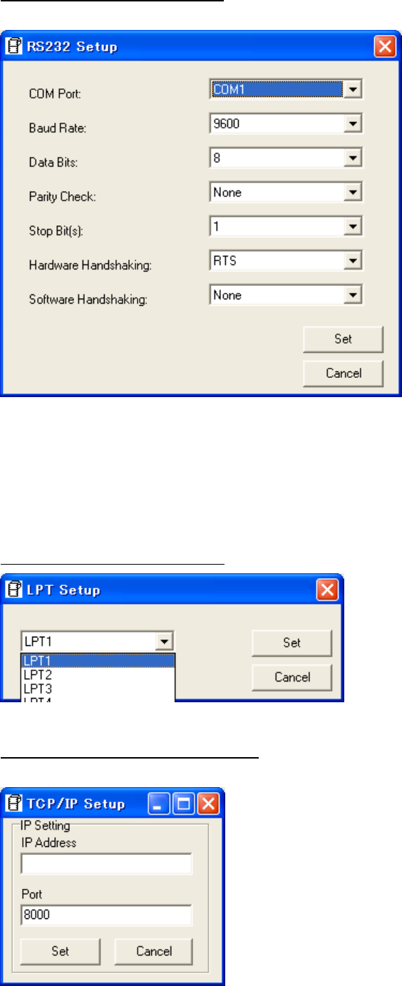 USB, COM (Serial), LPT (Parallel), or ETHERNET (LAN) can be selected.