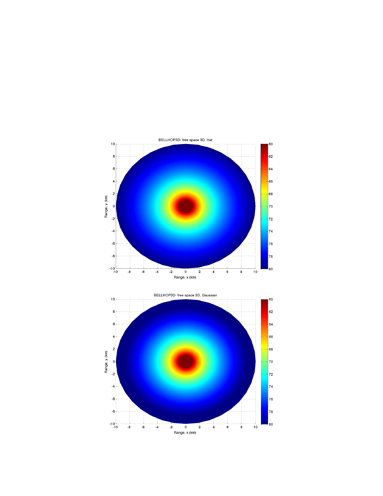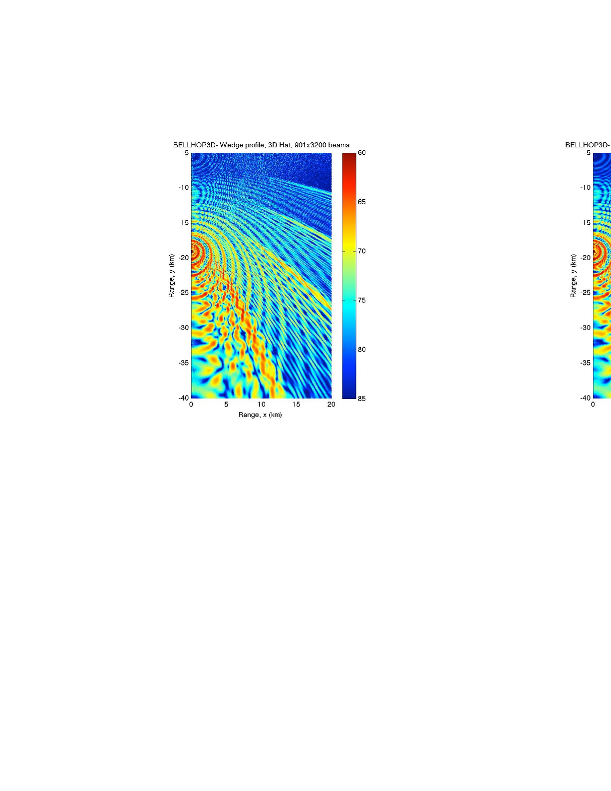 present BELLHOP3D results in Fig. 43 below. The upper panels are for the Hat-shaped beams,