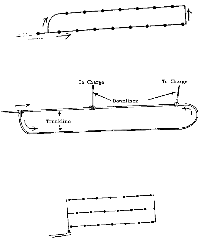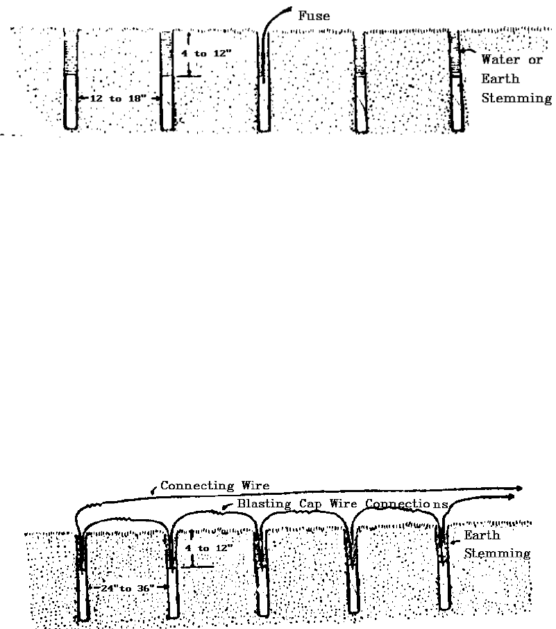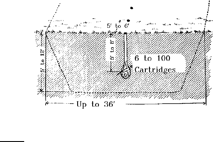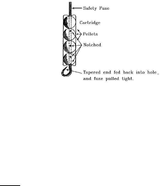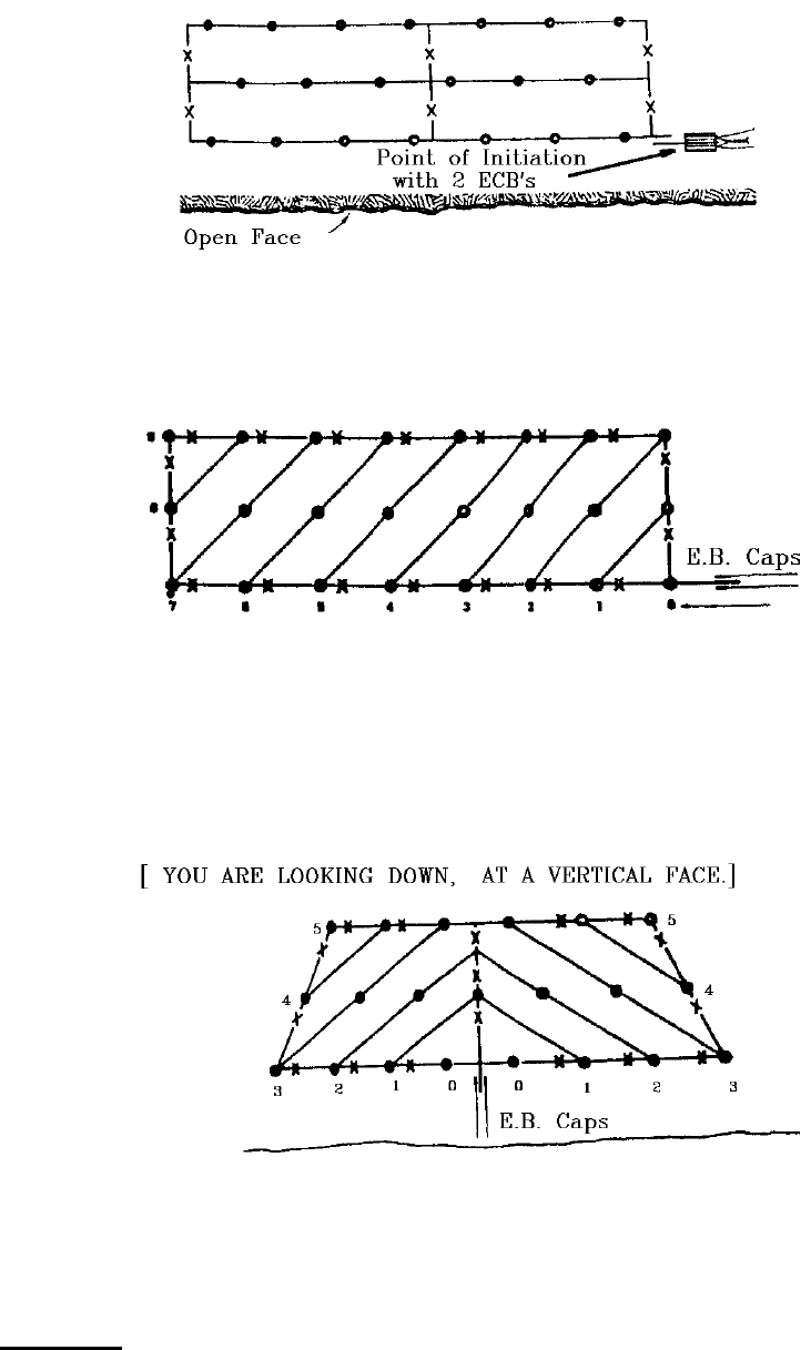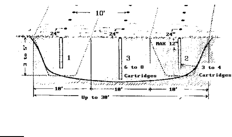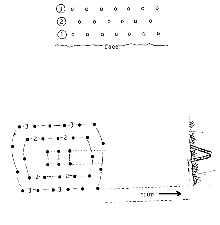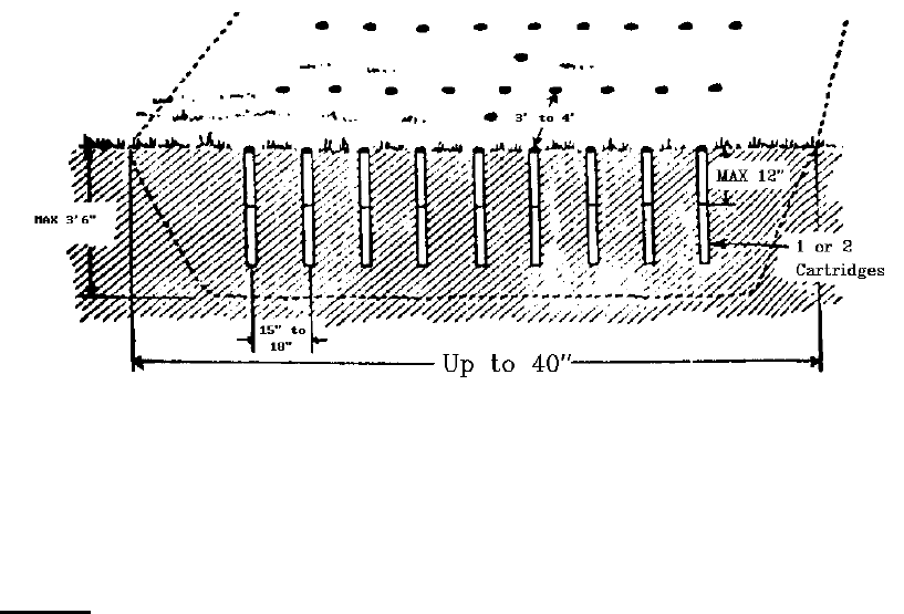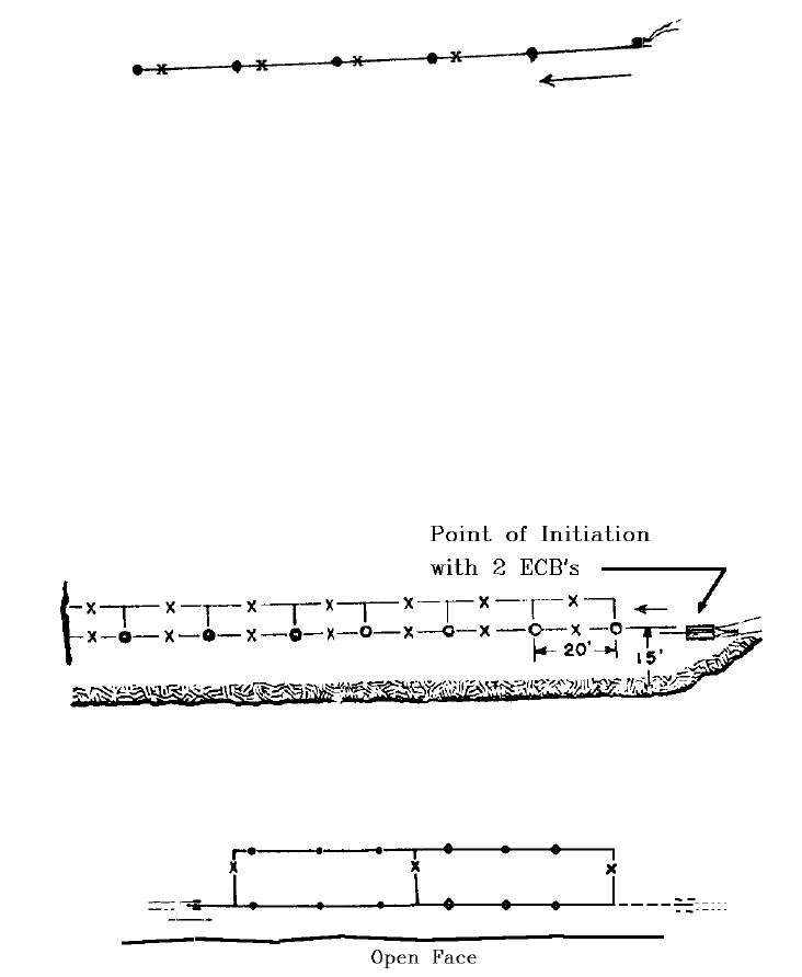 each row back approximately four feet from the previously blasted area. Three cartridges in each hole