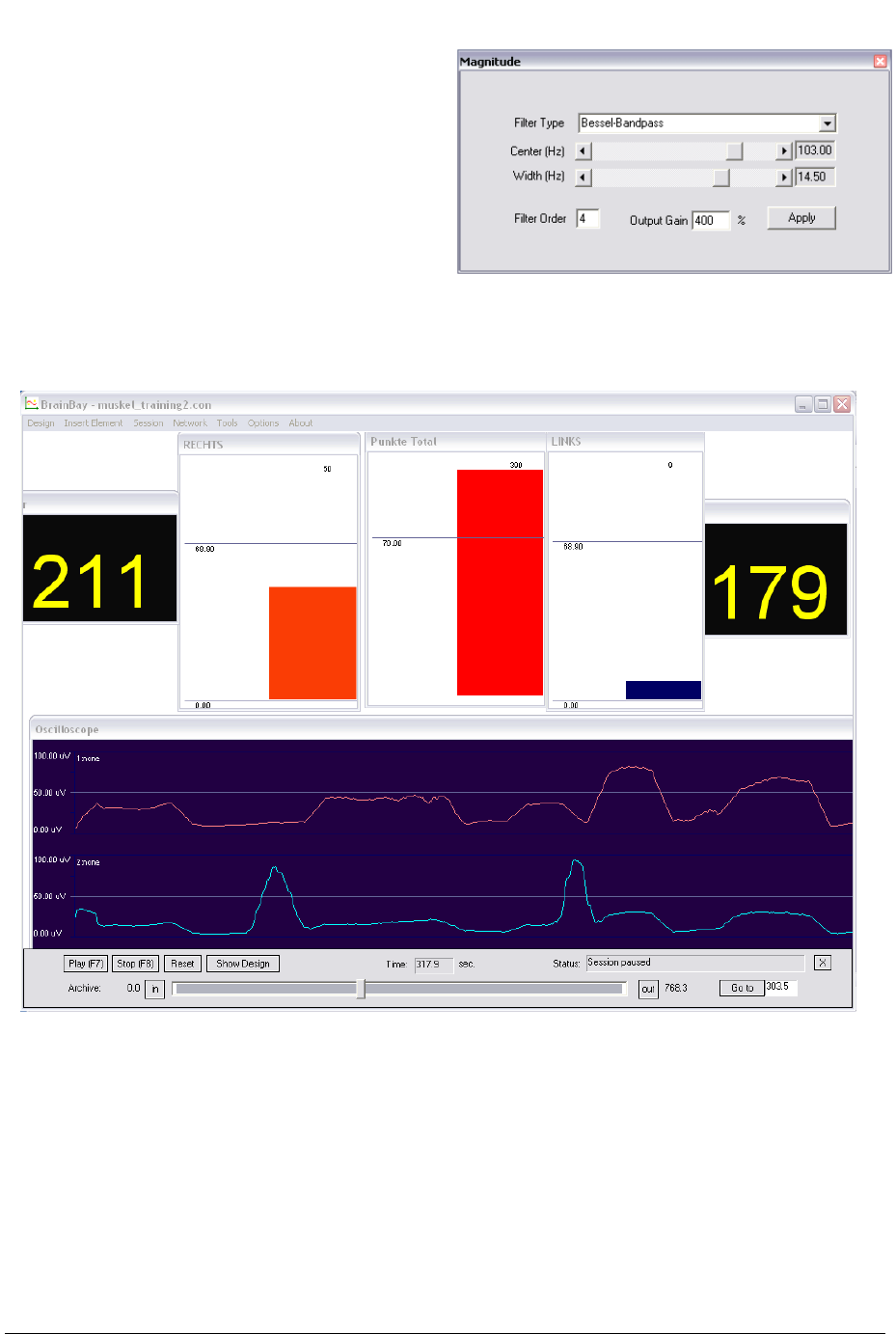 EMG-activity of two locations can be seen on the meter-displays. An acoustic signal