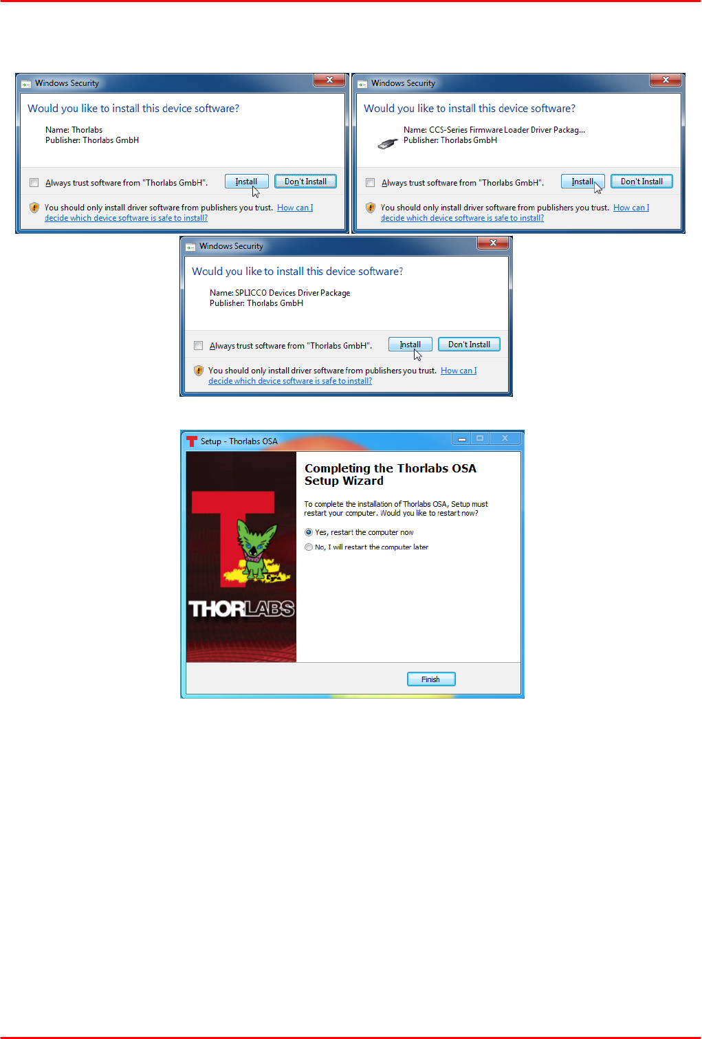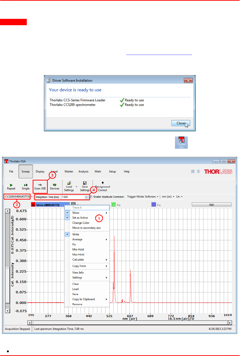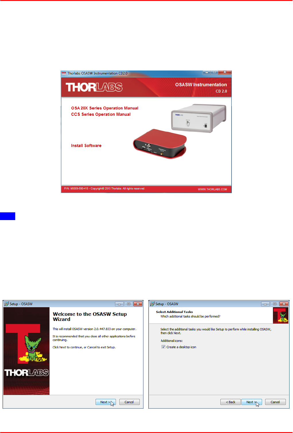 Do not connect the CCS Series Spectrometer to a PC prior to installingh the OSA-SW