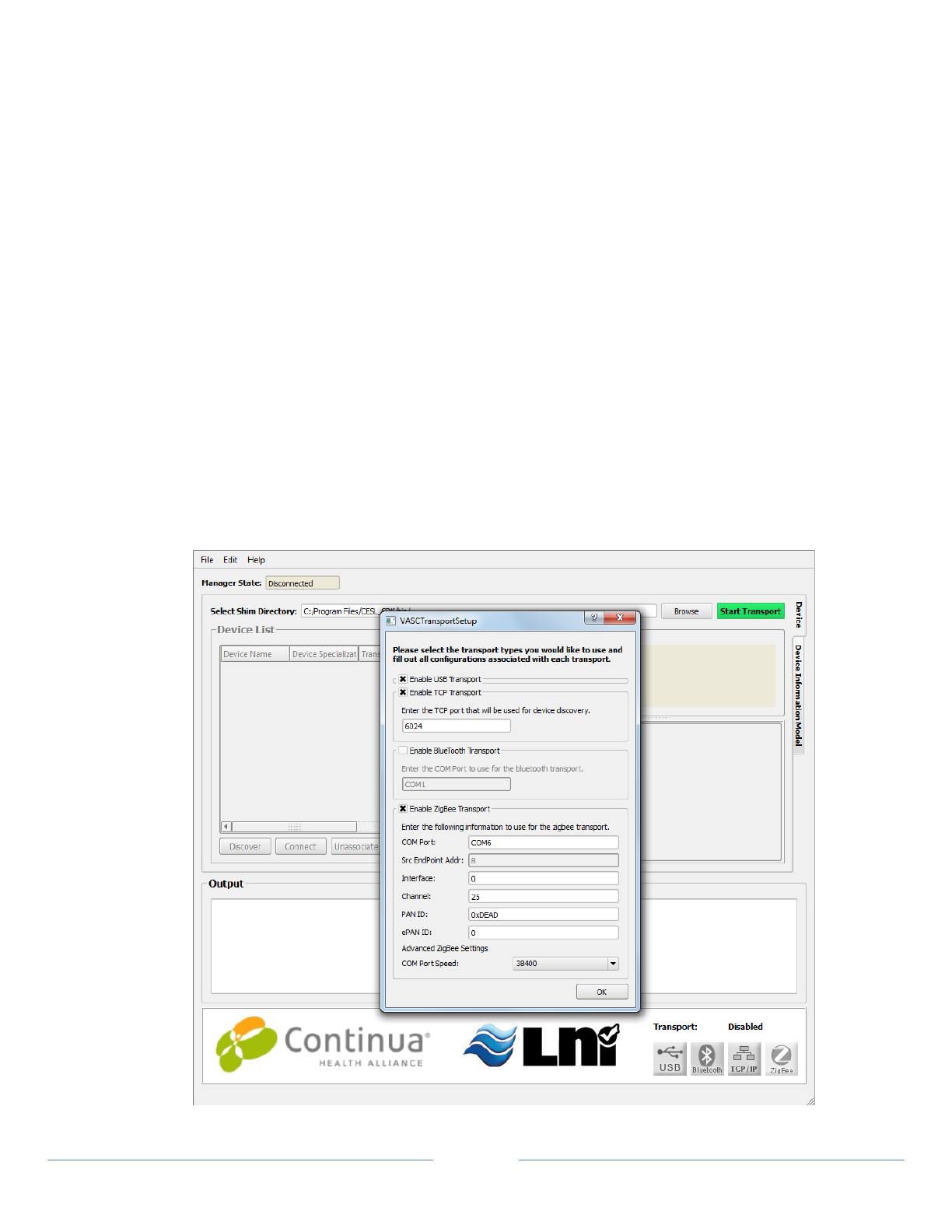 4. Start the CESL Manager and configure for the specific transport (TCP, USB, Bluetooth)
