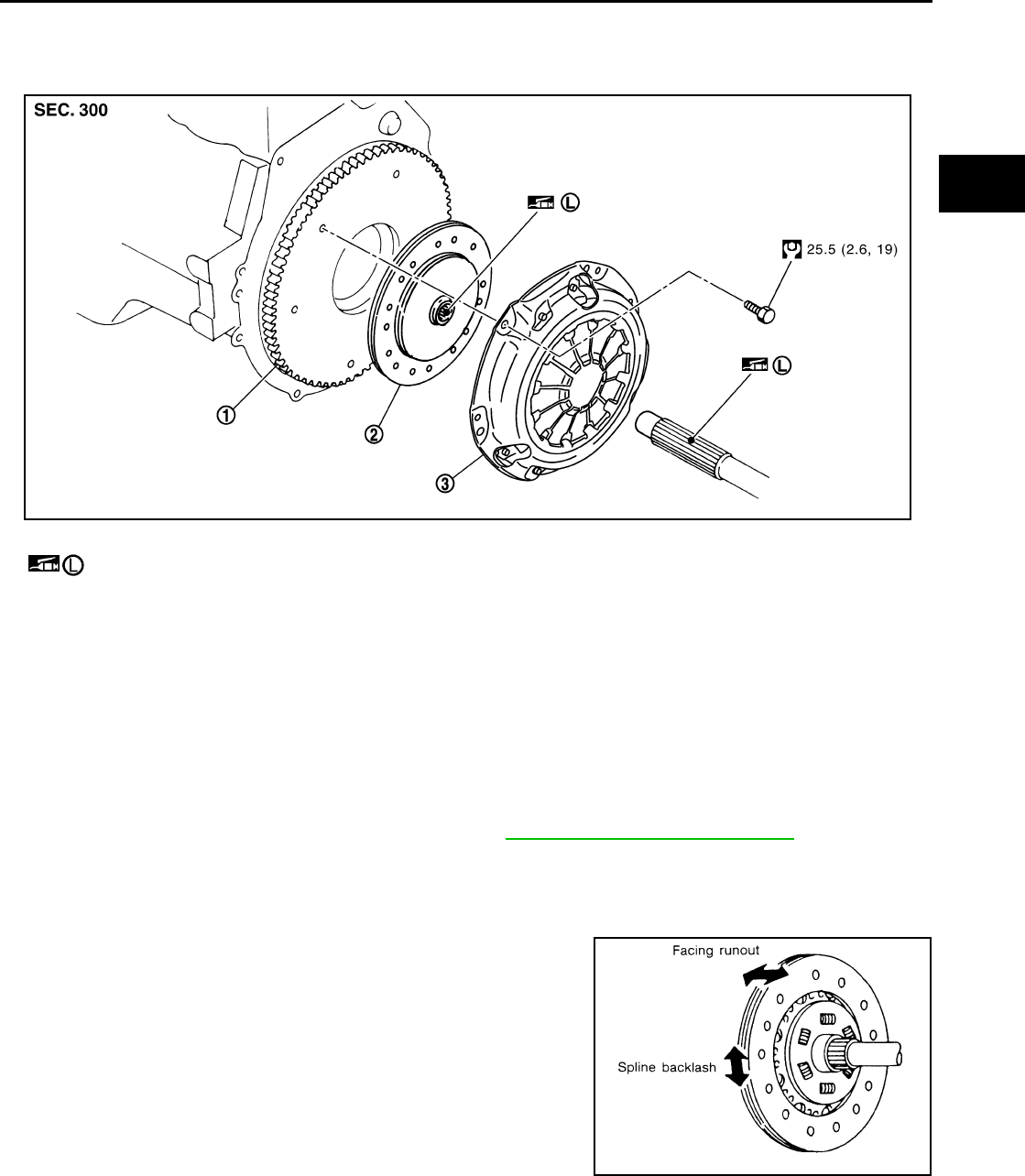 ●Be careful not to apply any grease to the clutch disc facing, pressure plate surface and flywheel