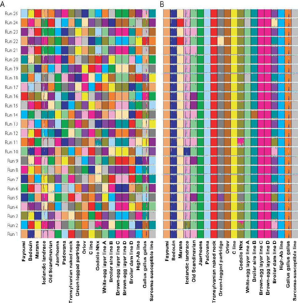 CLUMPP. The matrices are visualized using DISTRUCT. (A) Membership coefficients from
