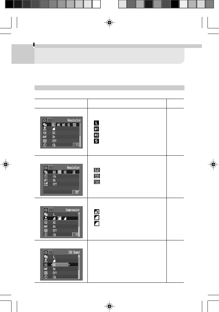The chart below is a reference for the settings available for various shooting