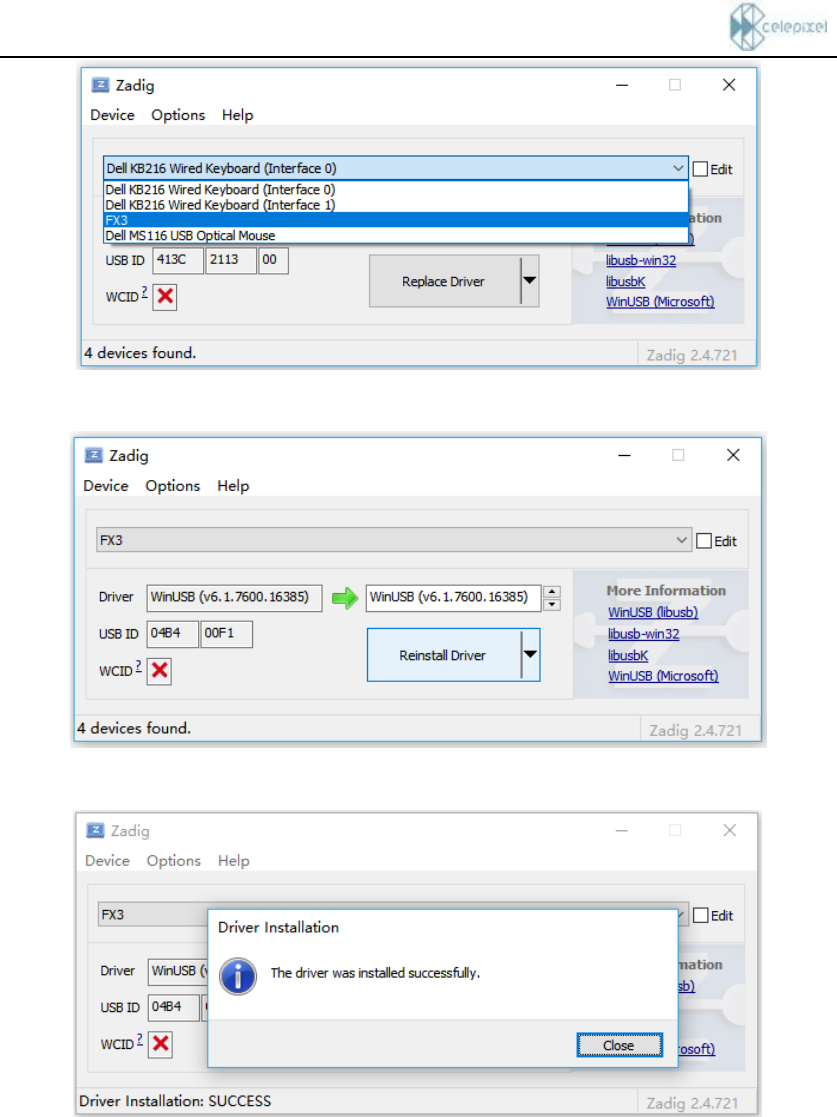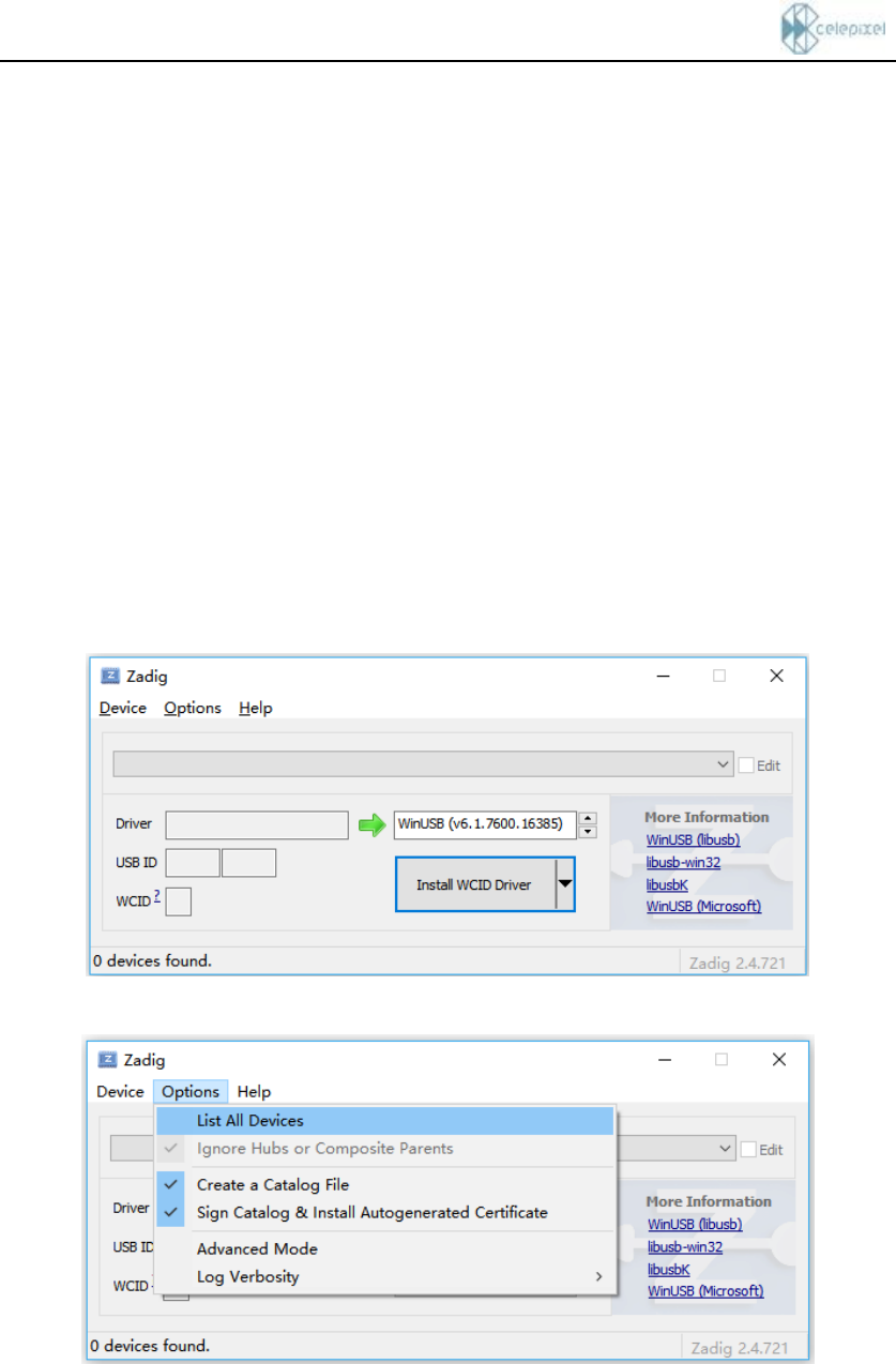 (1) Connect the CeleX-5 Sensor to the PC via the USB cable, double-click “zadig-2.4.exe” to pop