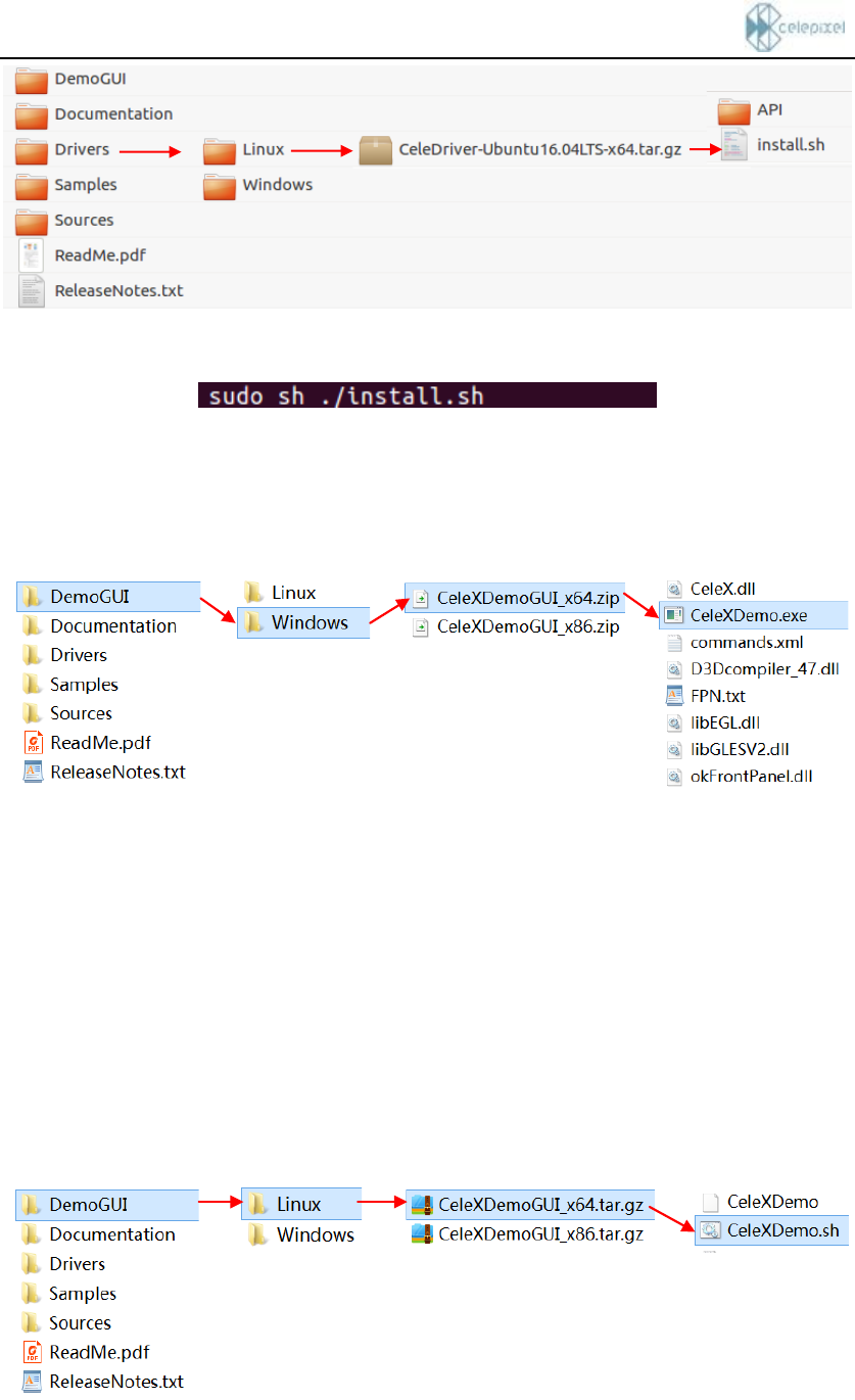 To install the driver for CeleX-5 Sensor on Linux,extract CeleDriver-Ubuntu16.04LTS-x64.tar.gz.