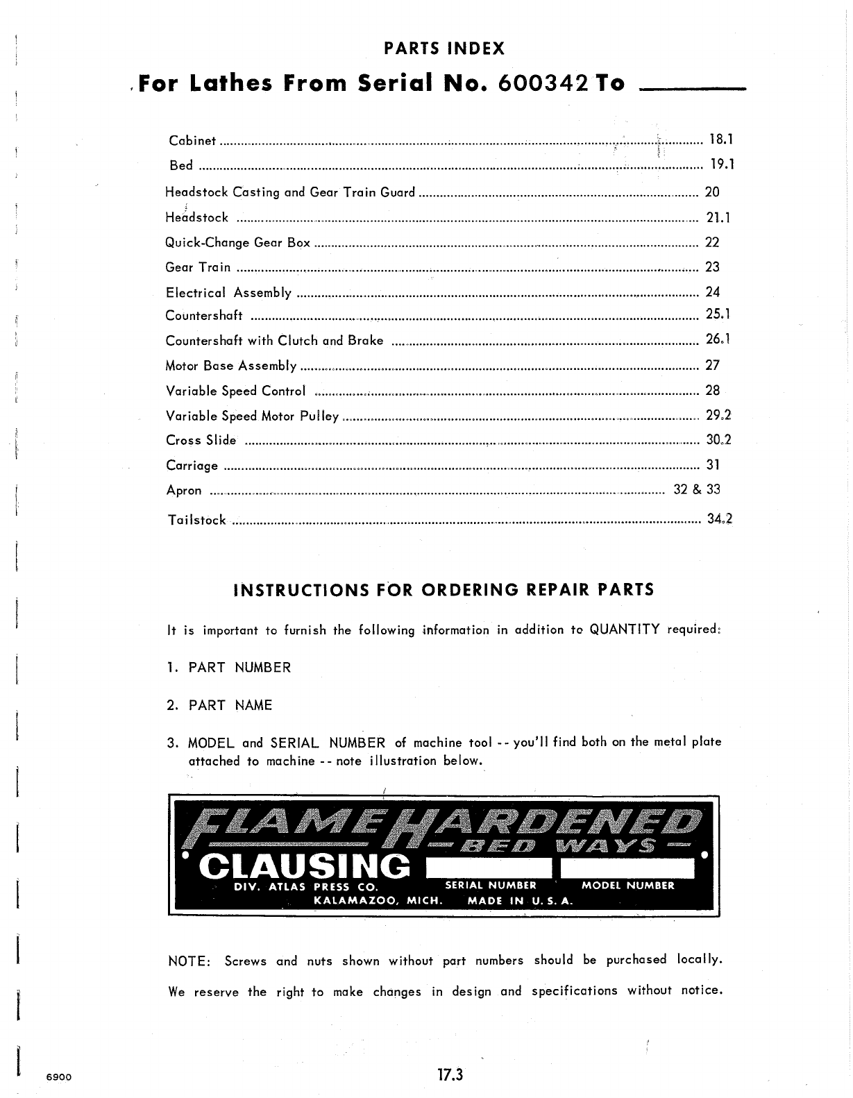 User Manual: Clausing-6900-Series-Parts Clausing == Clausing Lathe And Mill == Clausing Lathes == 6900