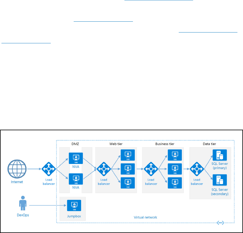 •The load balancers distribute network traffic to the web and business tiers. Scale horizontally by adding new VM instances. Note that you can scale the web and business