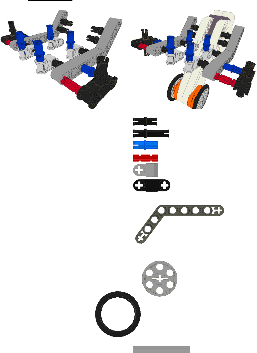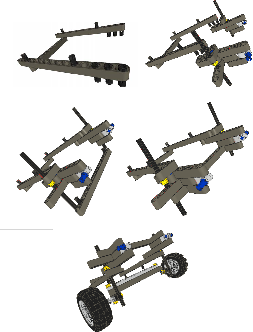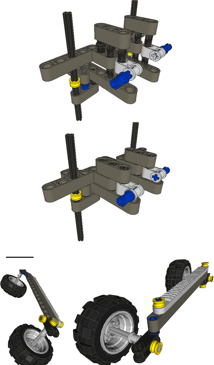 Assemble the wheels as shown taking note that the connection to each wheel to the cross arm is different. For