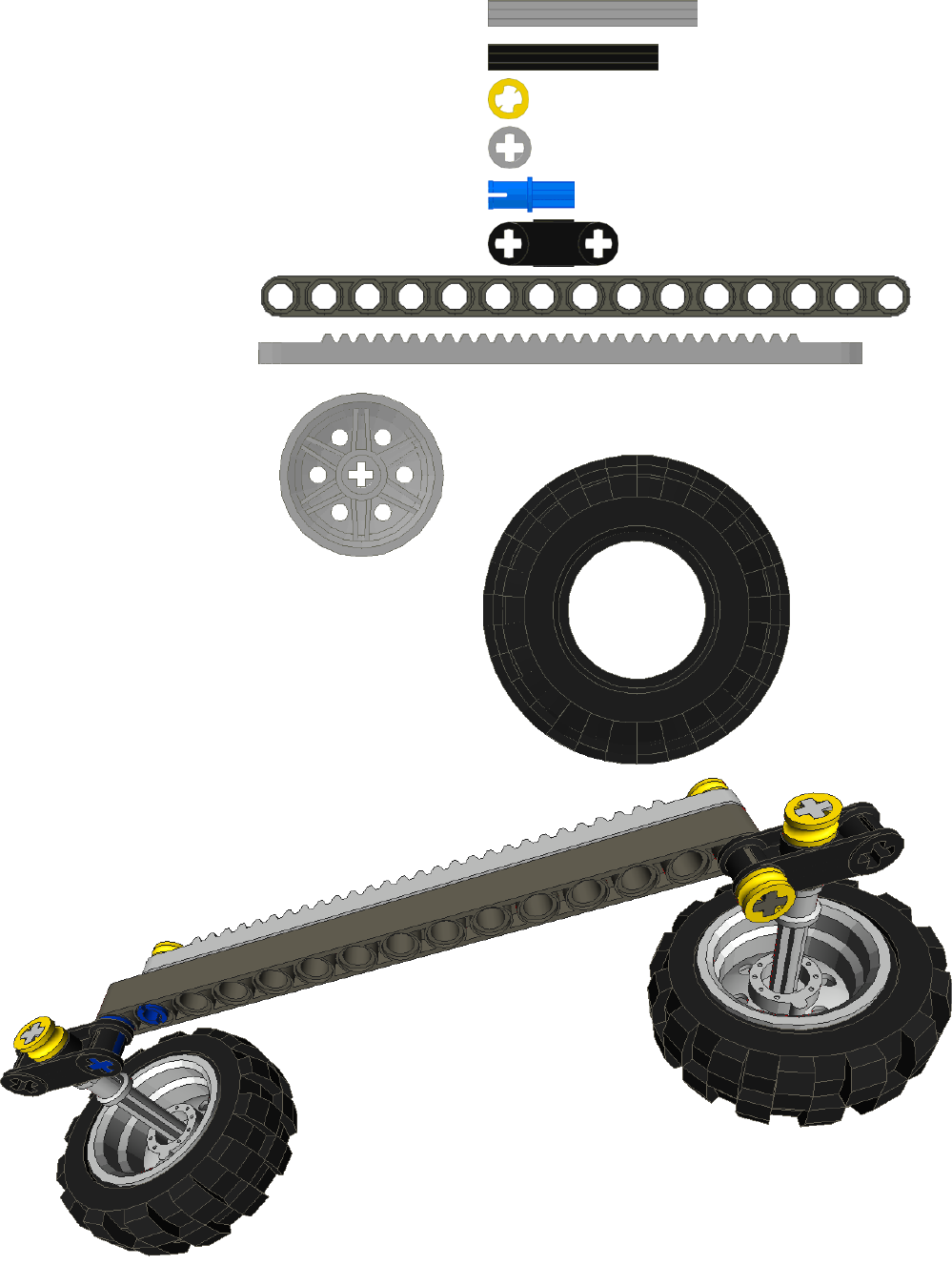 Turn over the chassis and attach the wheels and cross arm constructed earlier.