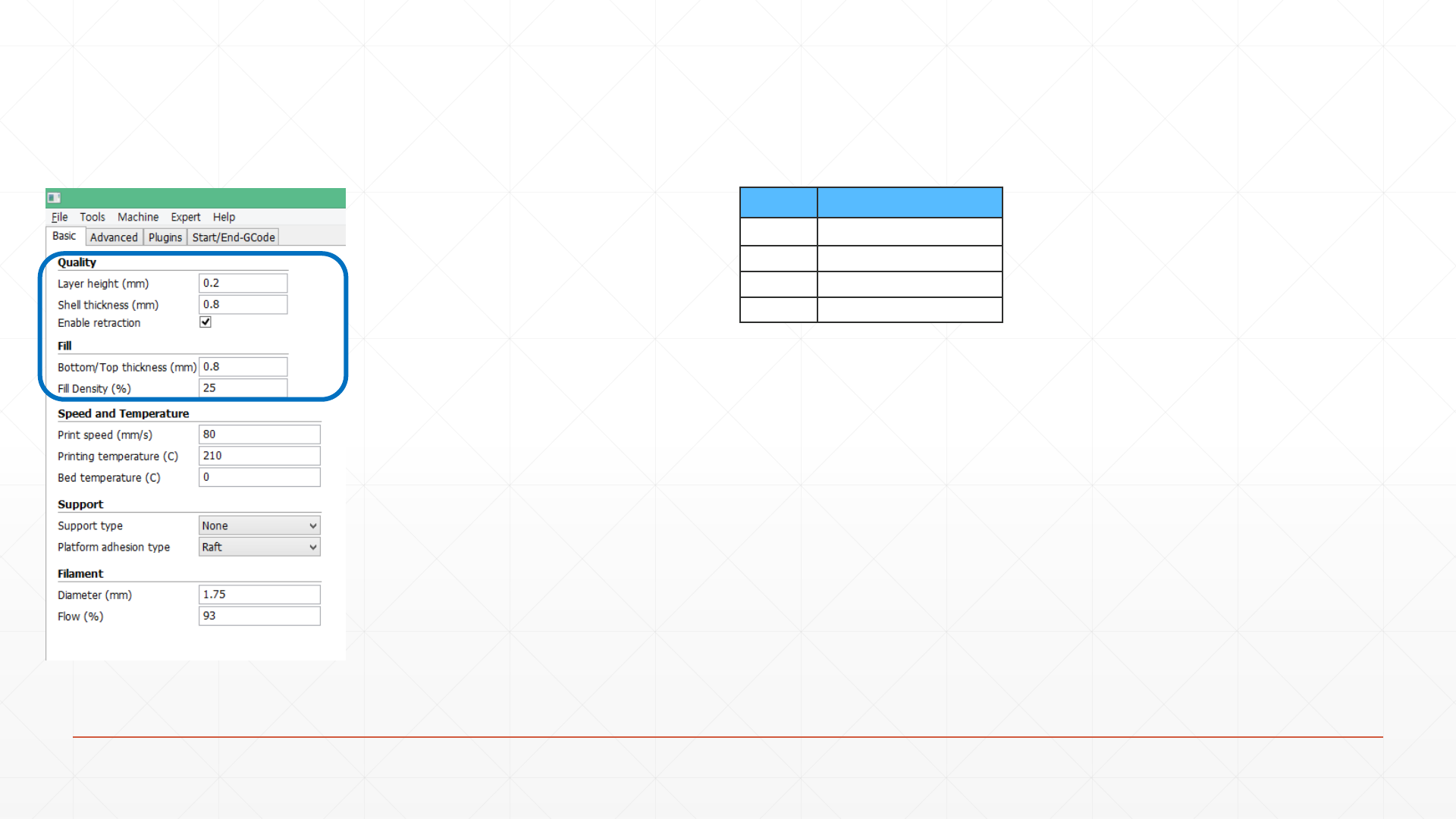 ◎High quality print : 느린속도 , 적층두께 얇음, 프린팅 시간 느림.