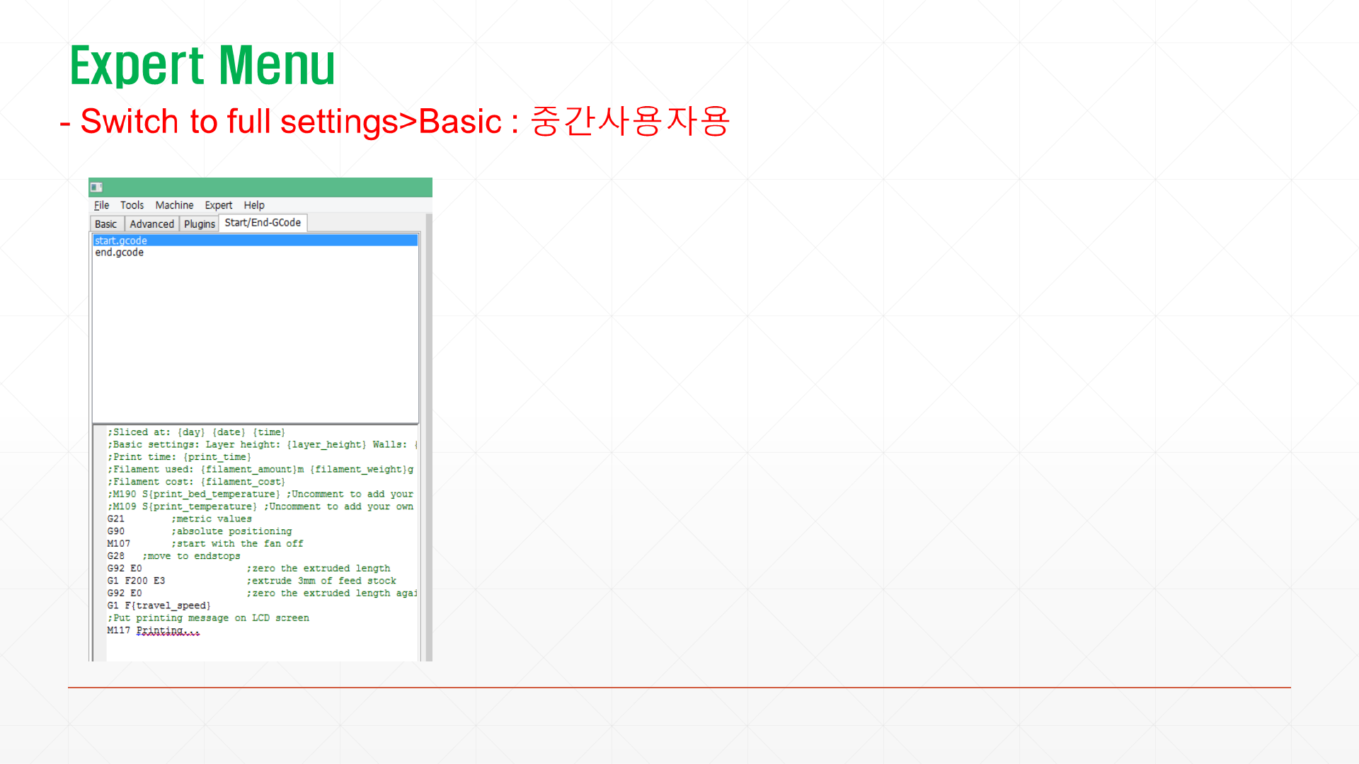Start/ End G-Code에서는 인쇄의 시작과 종료의 절차를 보여줍니다. 이코드들은