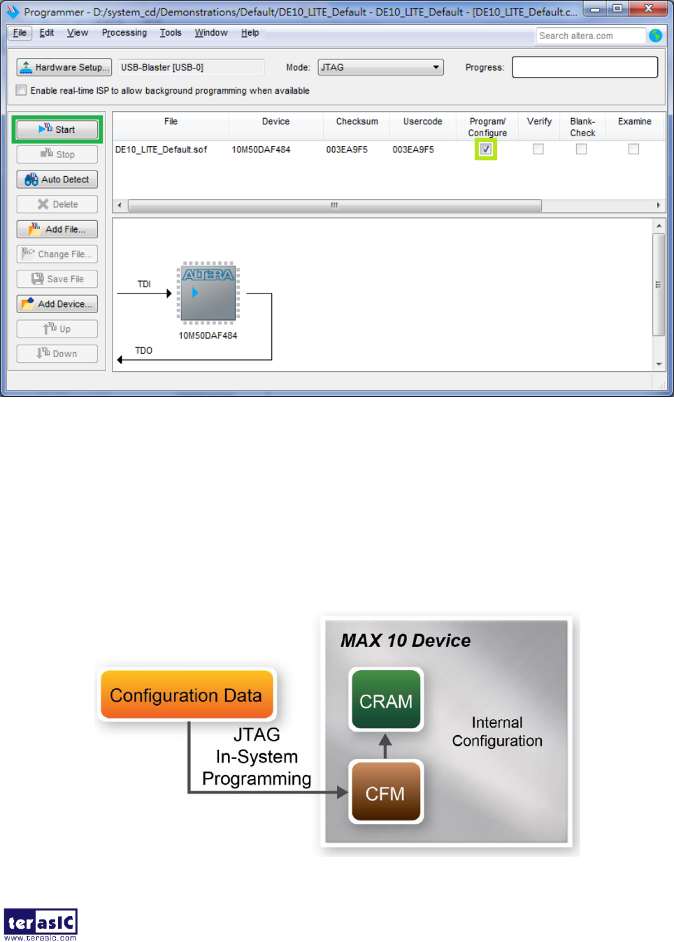 MAX 10 device with the .pof file created in Quartus II Programmer.