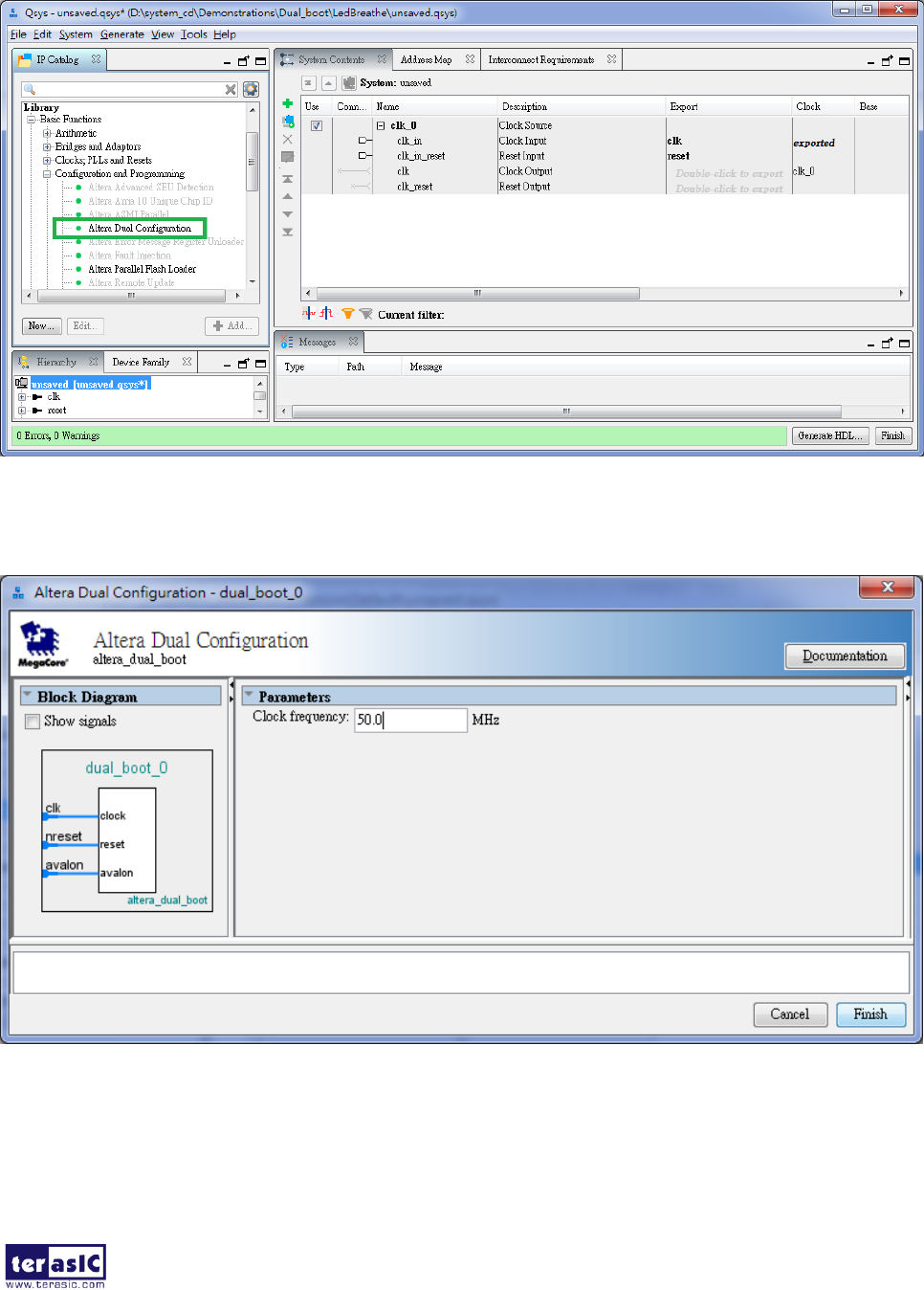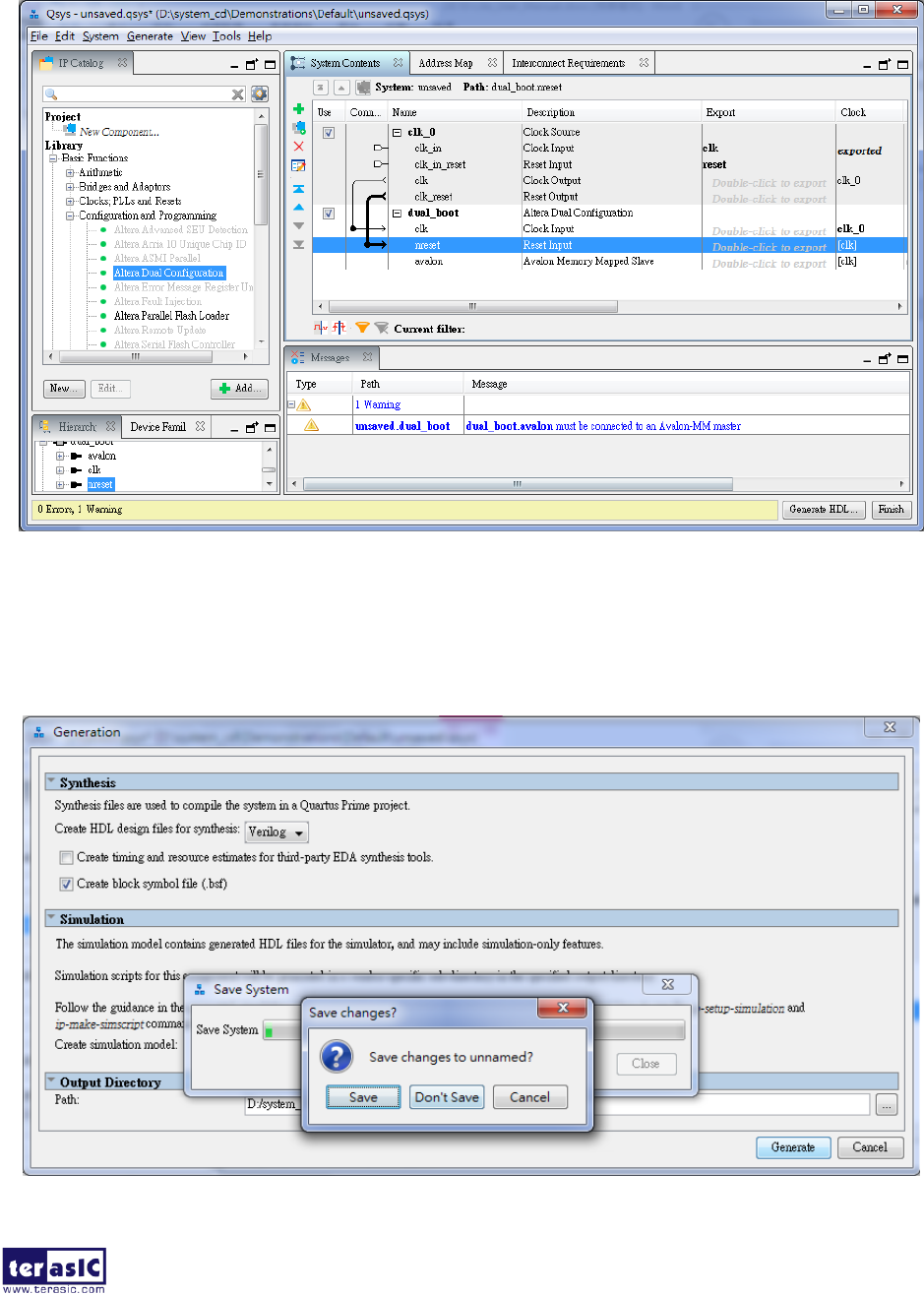 Figure 6-8. Click Save it as dual_boot.qsys and the generation start. If there is no error in the