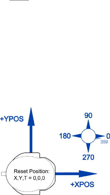 At power-up or reset, the position of the robot defaults to X,Y,θ=0,0,0. The coordinate system is shown in