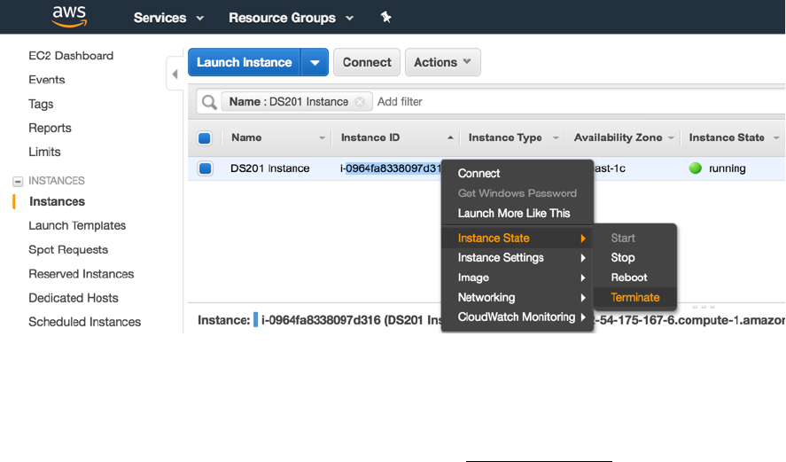 From the list of instances, find the instance you want to terminate. Right-click on that instance, and select