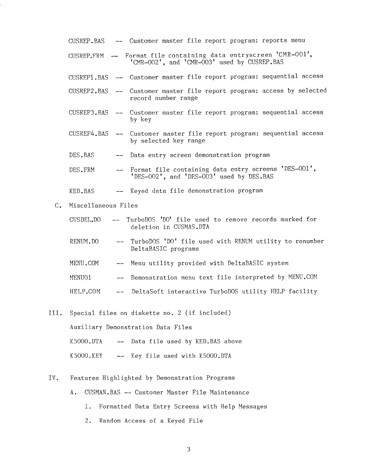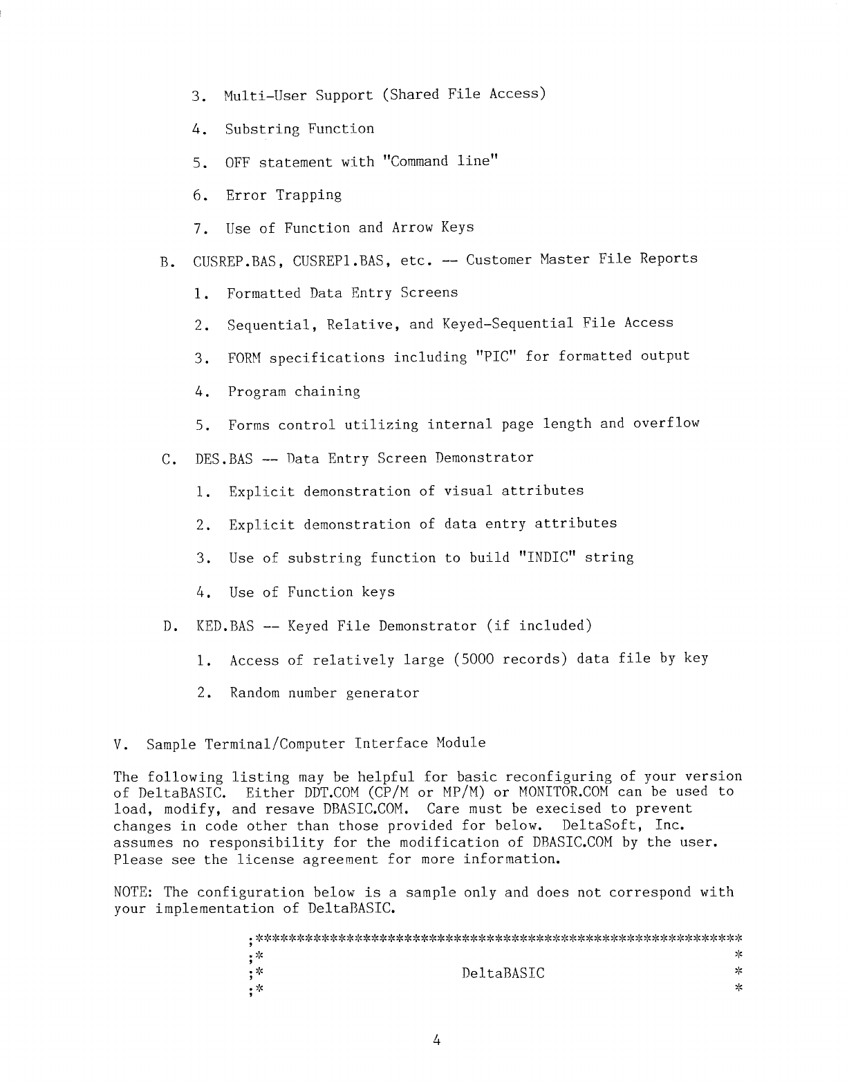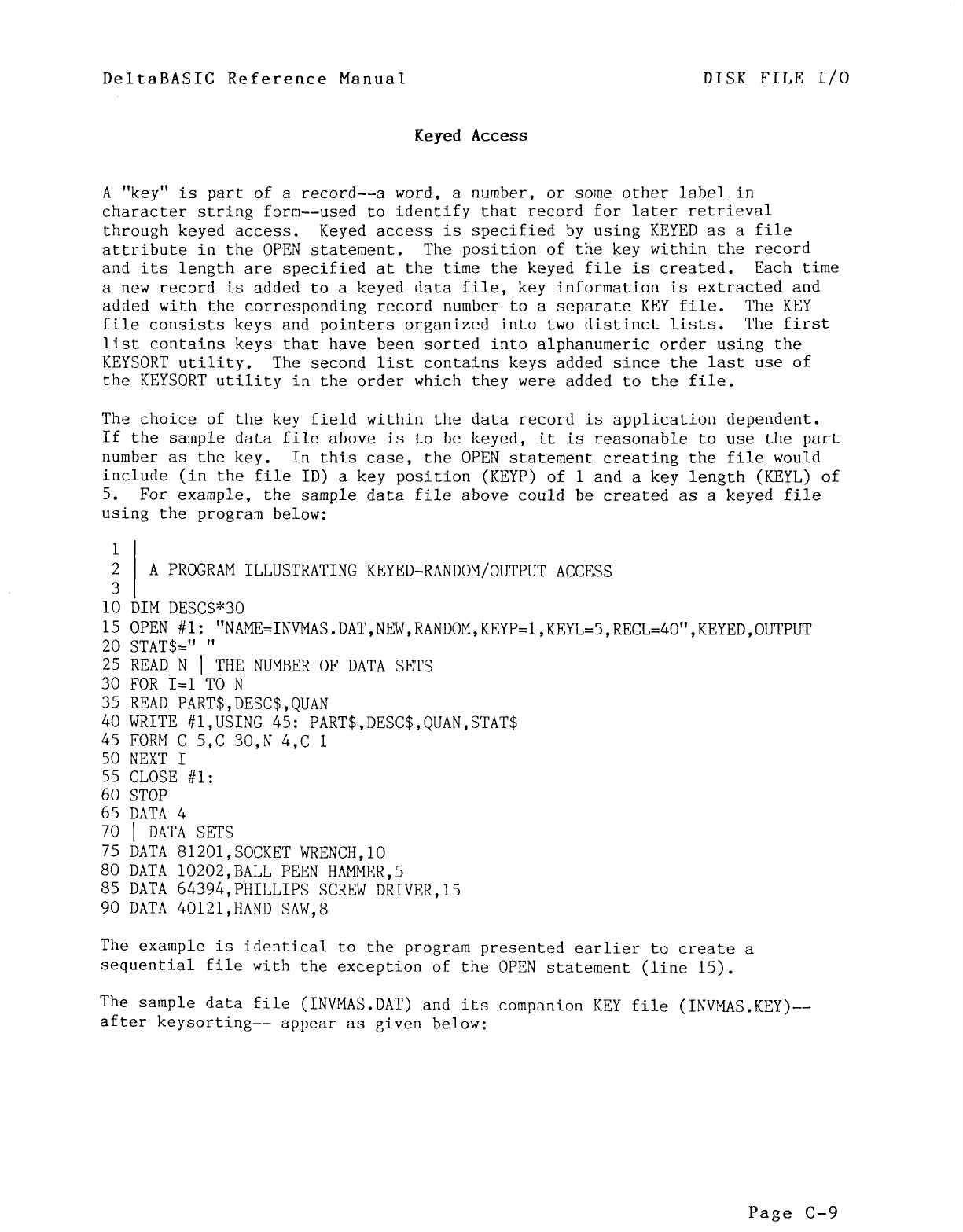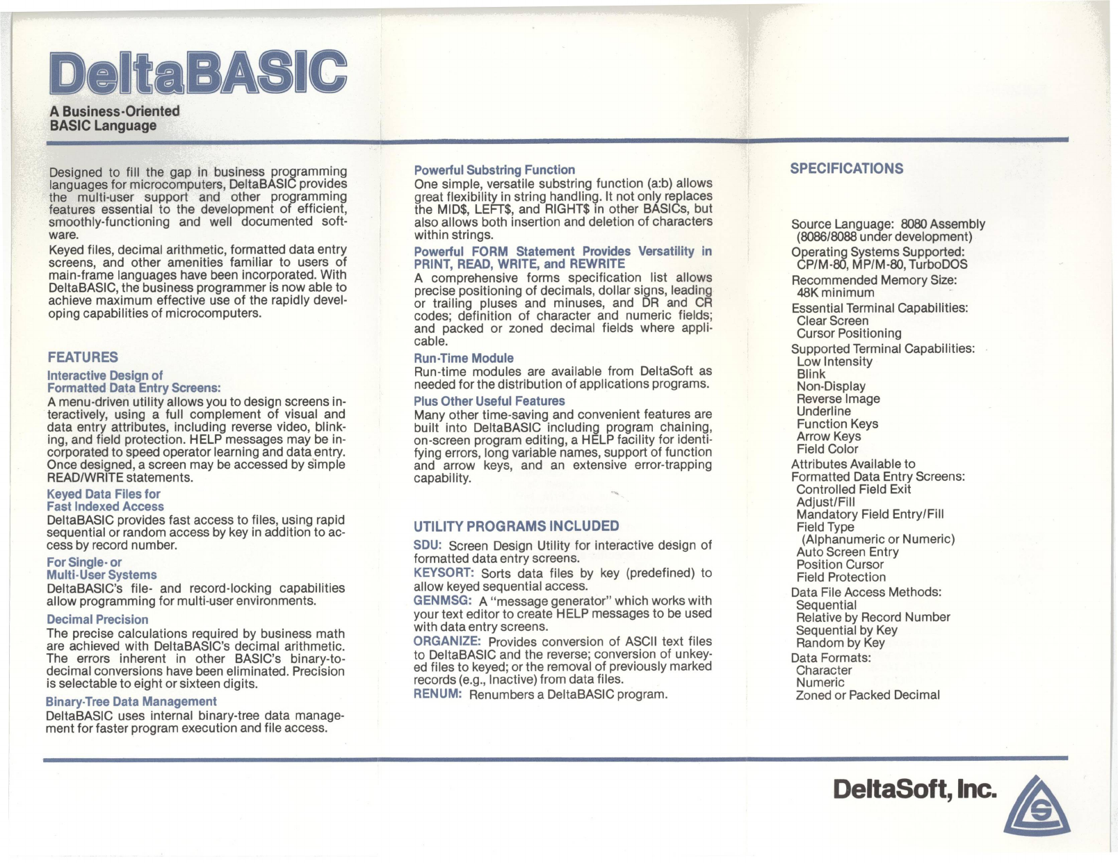 DeltaBASIC provides fast access to files, using rapid UTILITY PROGRAMS INCLUDED Mandatory Field Entry/Fill