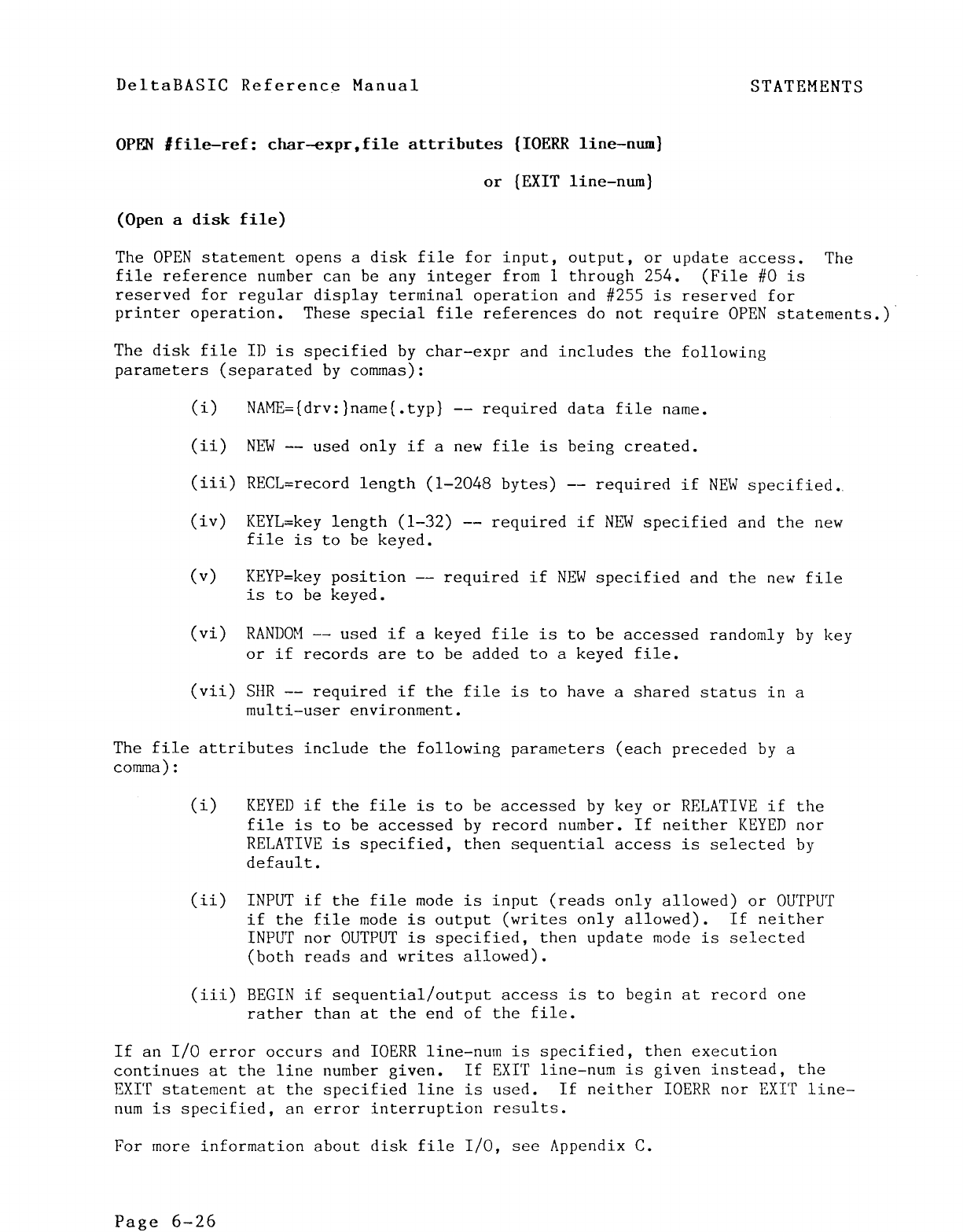 Intrinsic Functions OPEN-disk file, 6-9, 6-26, 6-43,