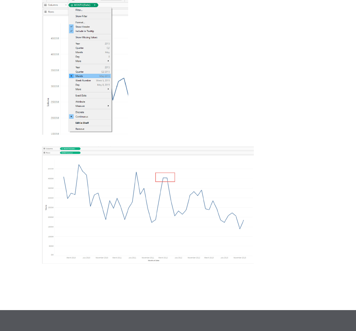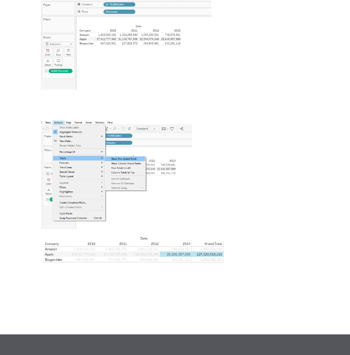 format on Columns, and placing SUM(Volume) on Rows.