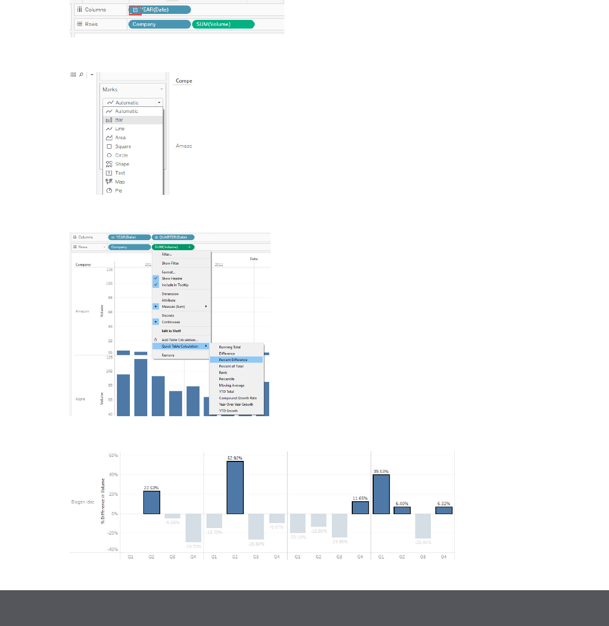 On Rows, right-click SUM(Volume), click Quick Table Calculation, and then select Percent Dierence.