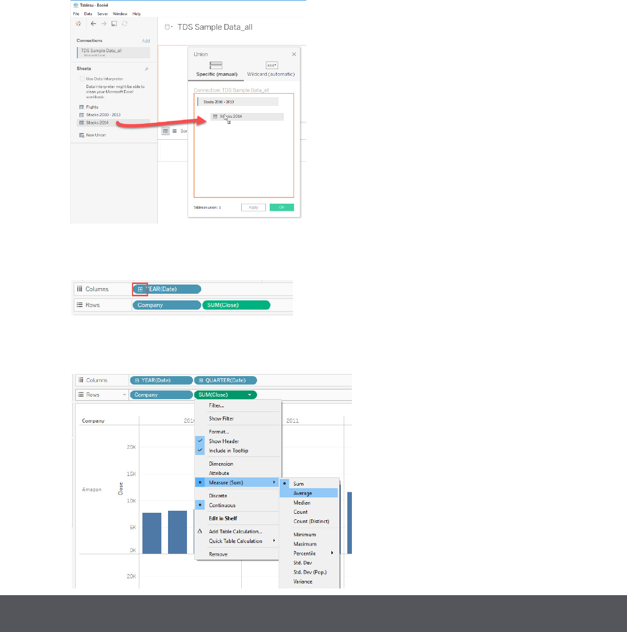 New Union. Drag Stocks 2010-2013 into the dialog box. Then drag Stocks 2014 into the dialog box, click