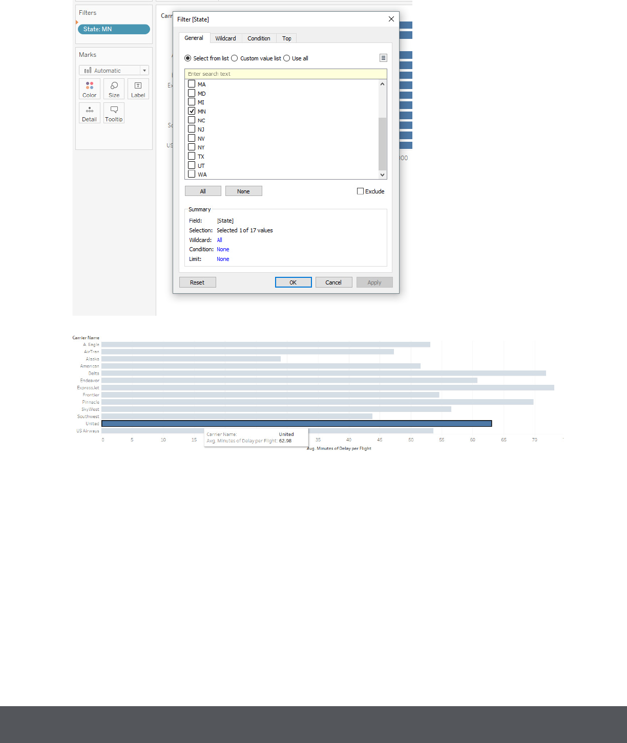 Drag State to Filters and then select ‘MN’ to lter to only show values for Minnesota.