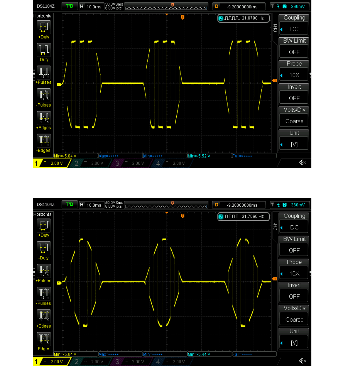 see the edges of the pulses change shape to follow a logarithmic curve, like this:
