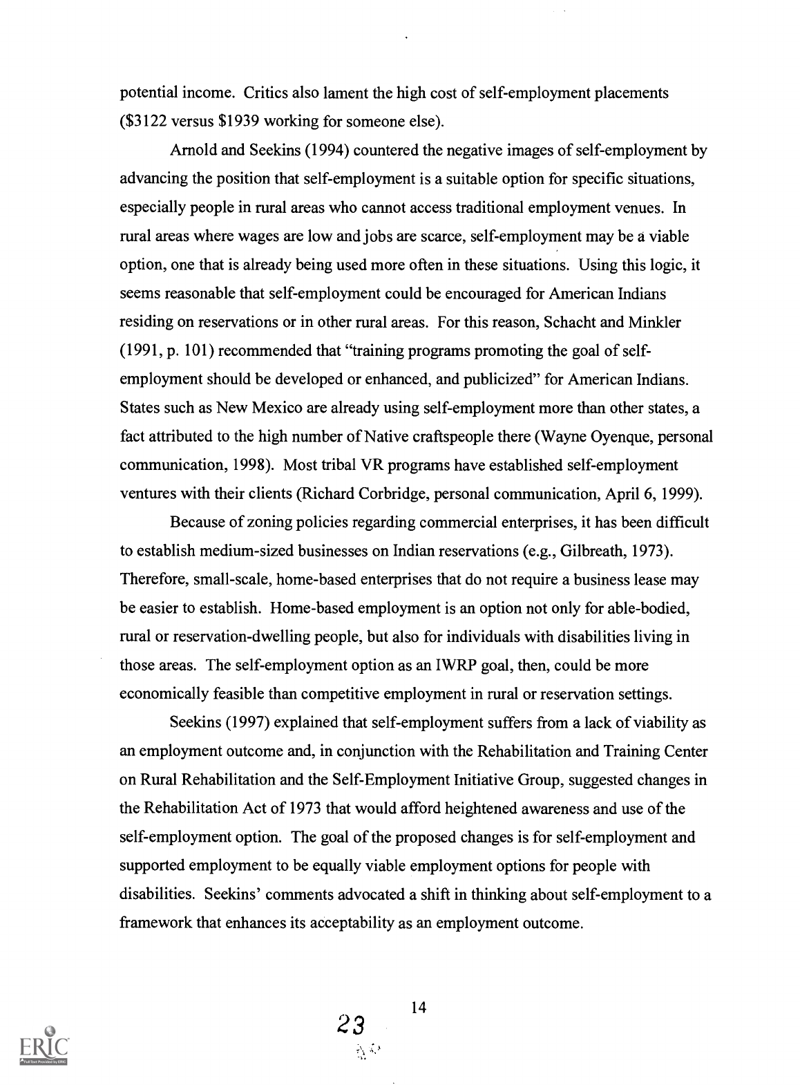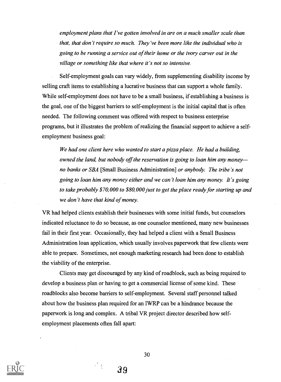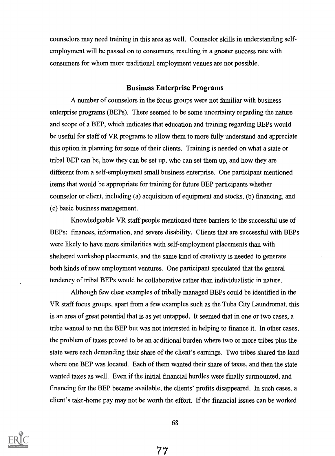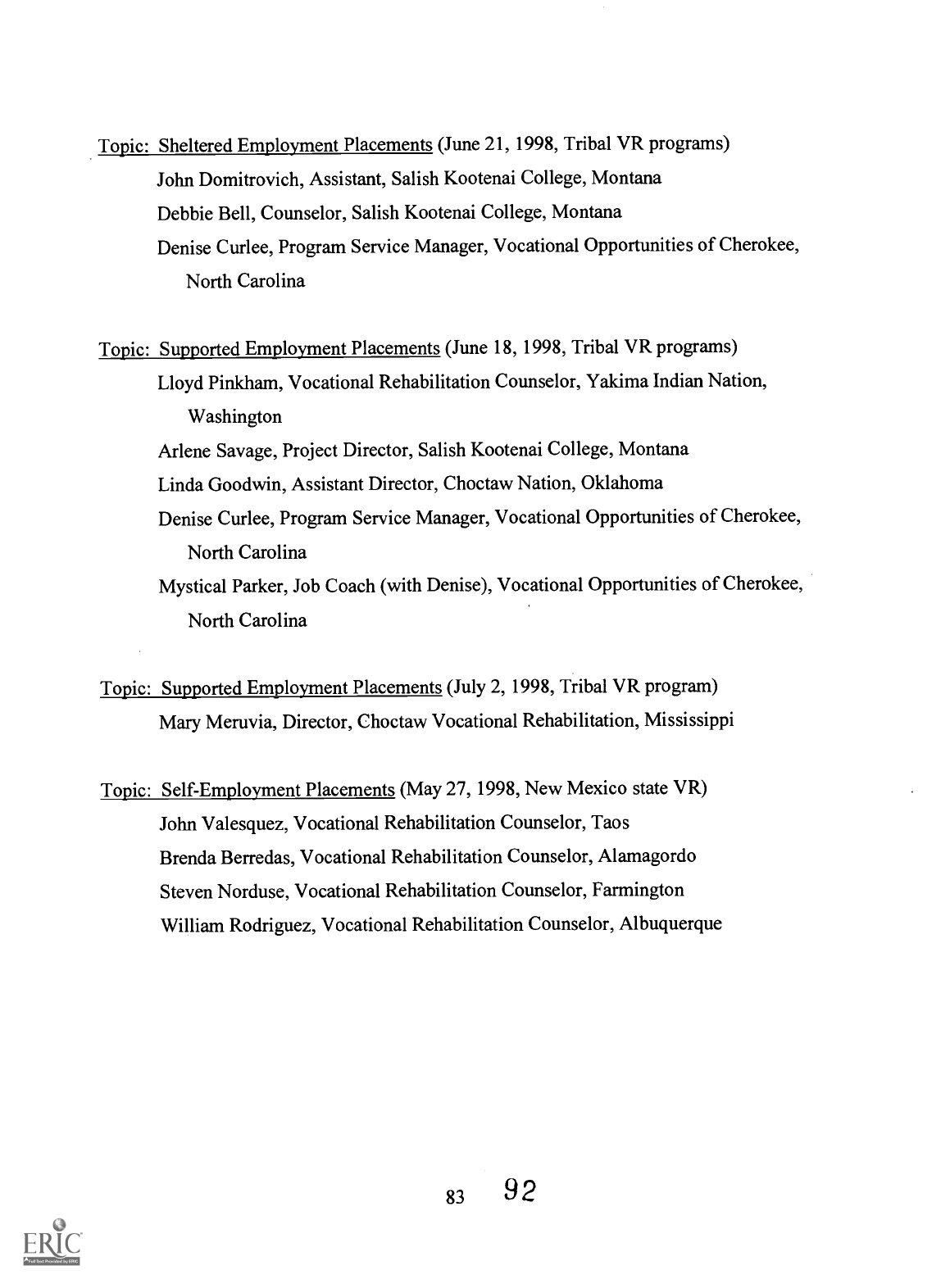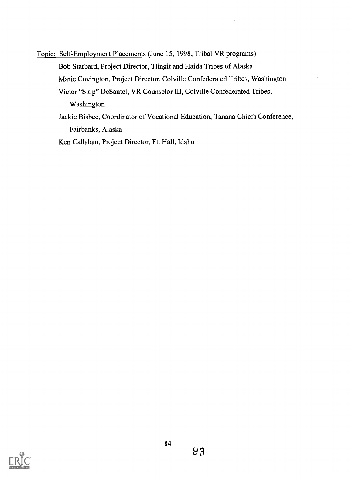 Topic: Self-Employment Placements (June 15, 1998, Tribal VR programs)