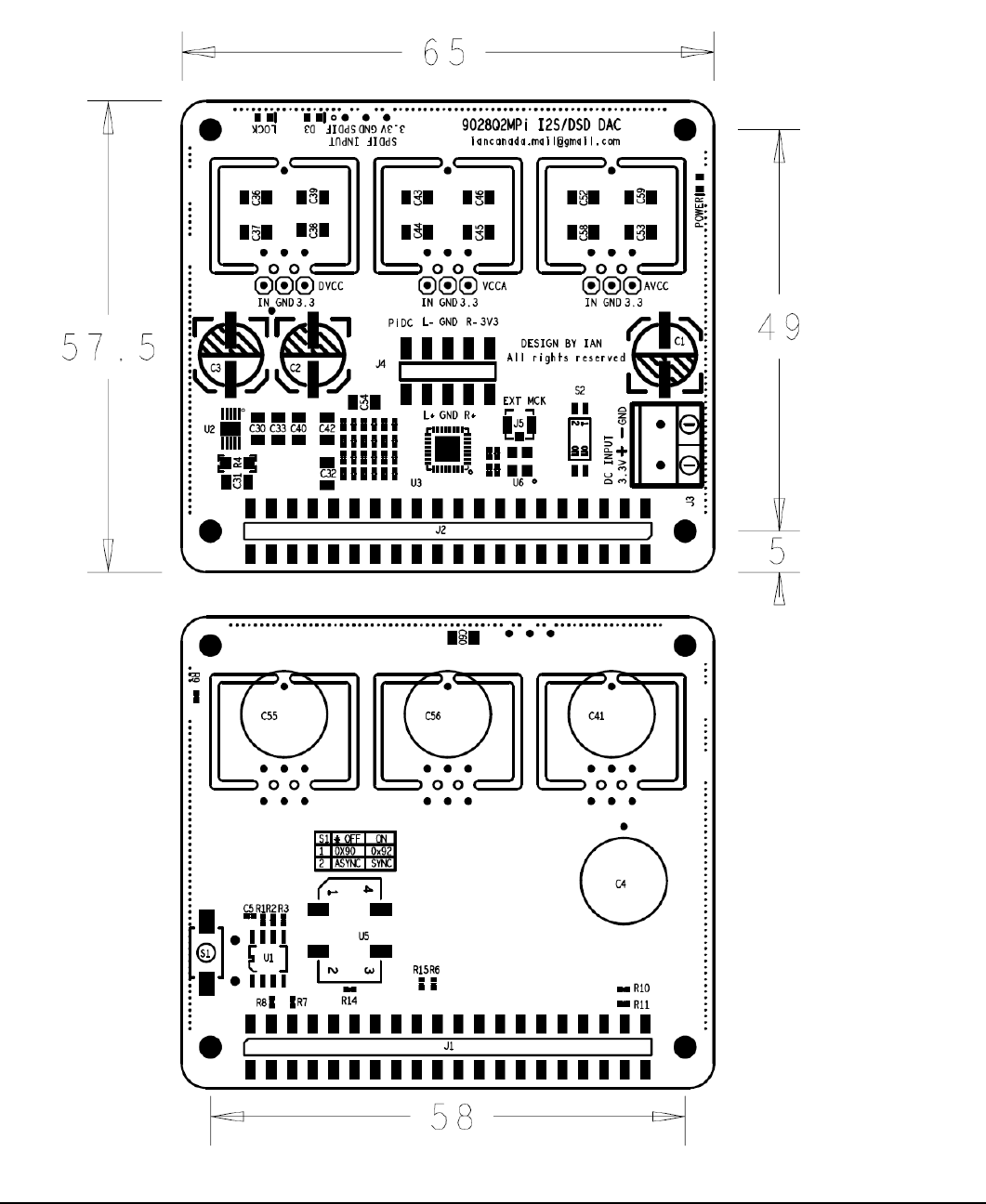 Then install three similar-sized low-noise LDO regulator boards at the IN, GND, and 3.3V pins at DVCC/GND,
