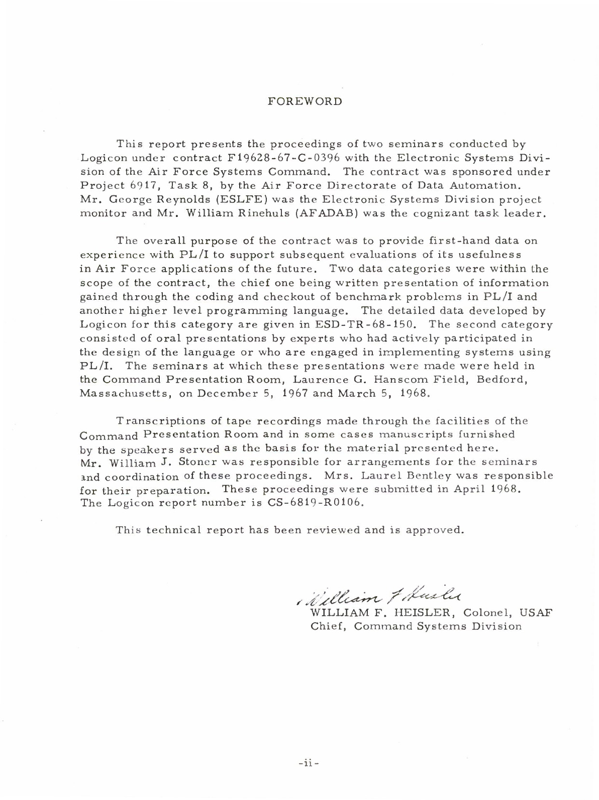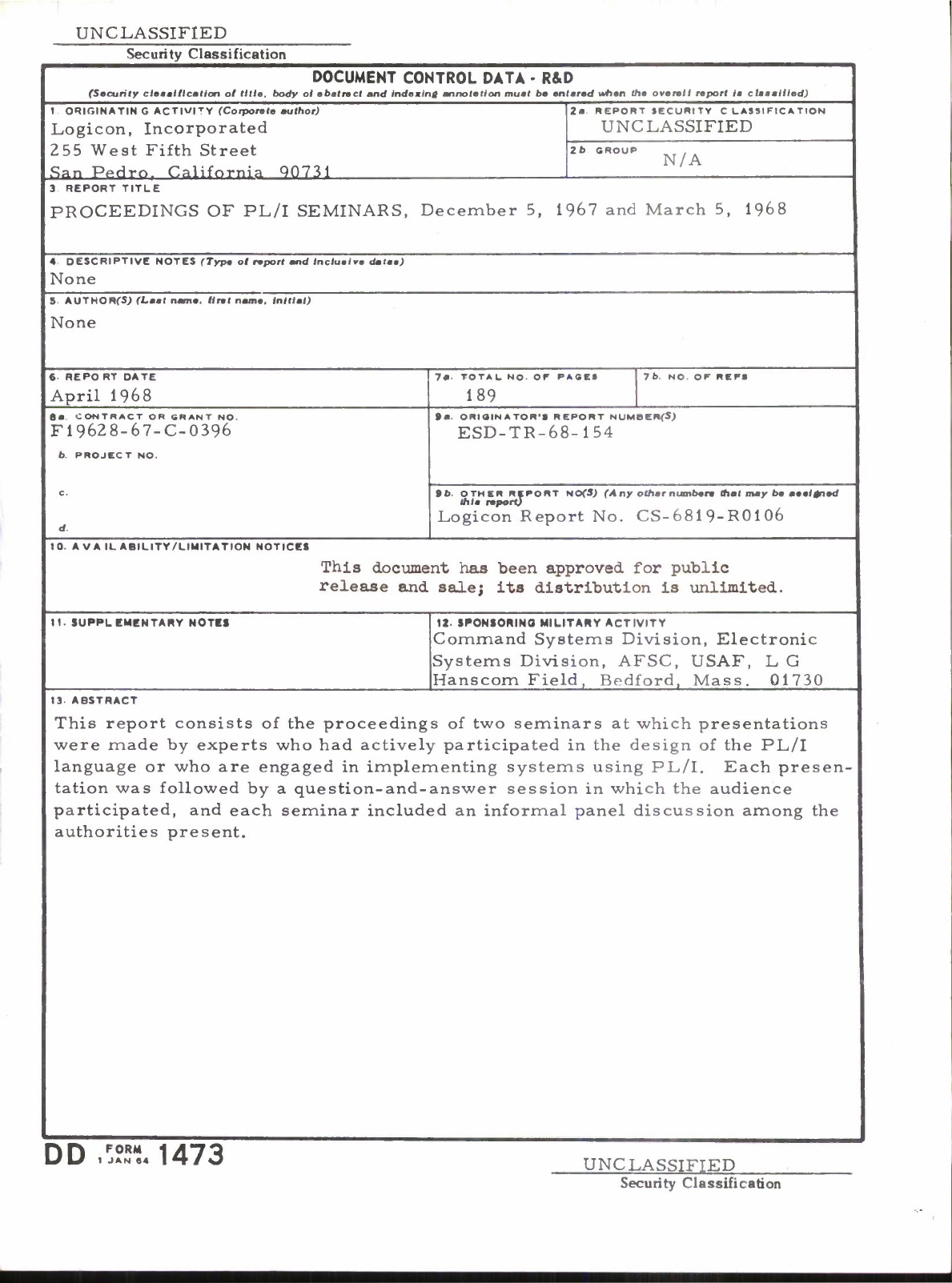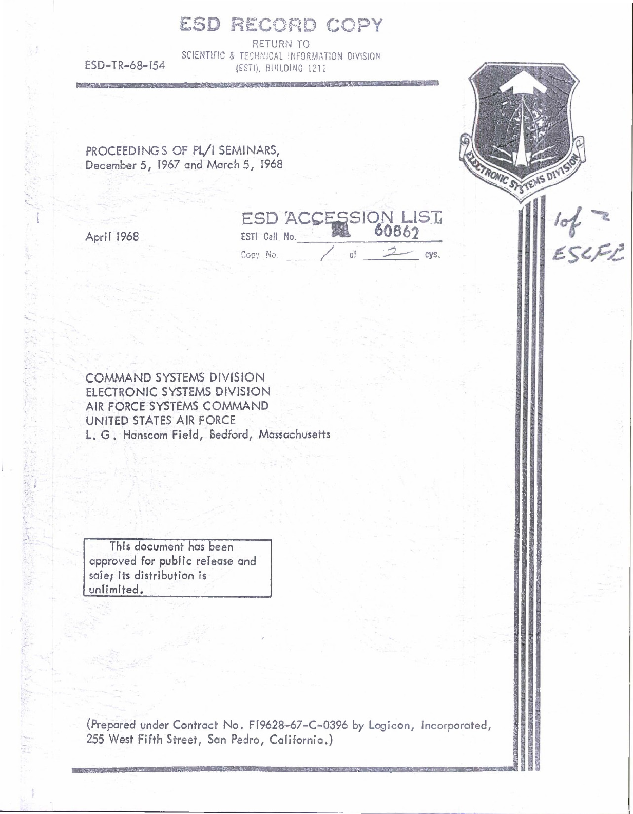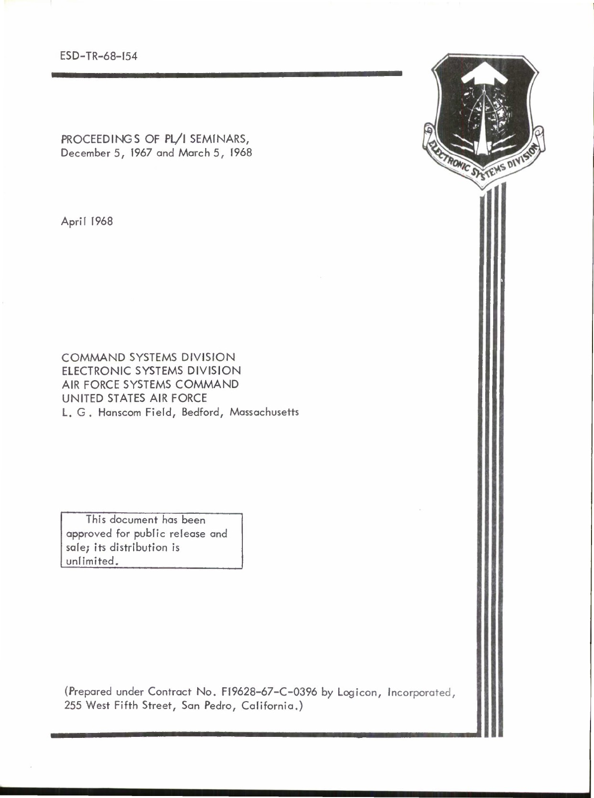 ESD TR 68 154_Proceedings_of_PL1_Seminars_Apr68 154 Proceedings Of PL1 Seminars Apr68