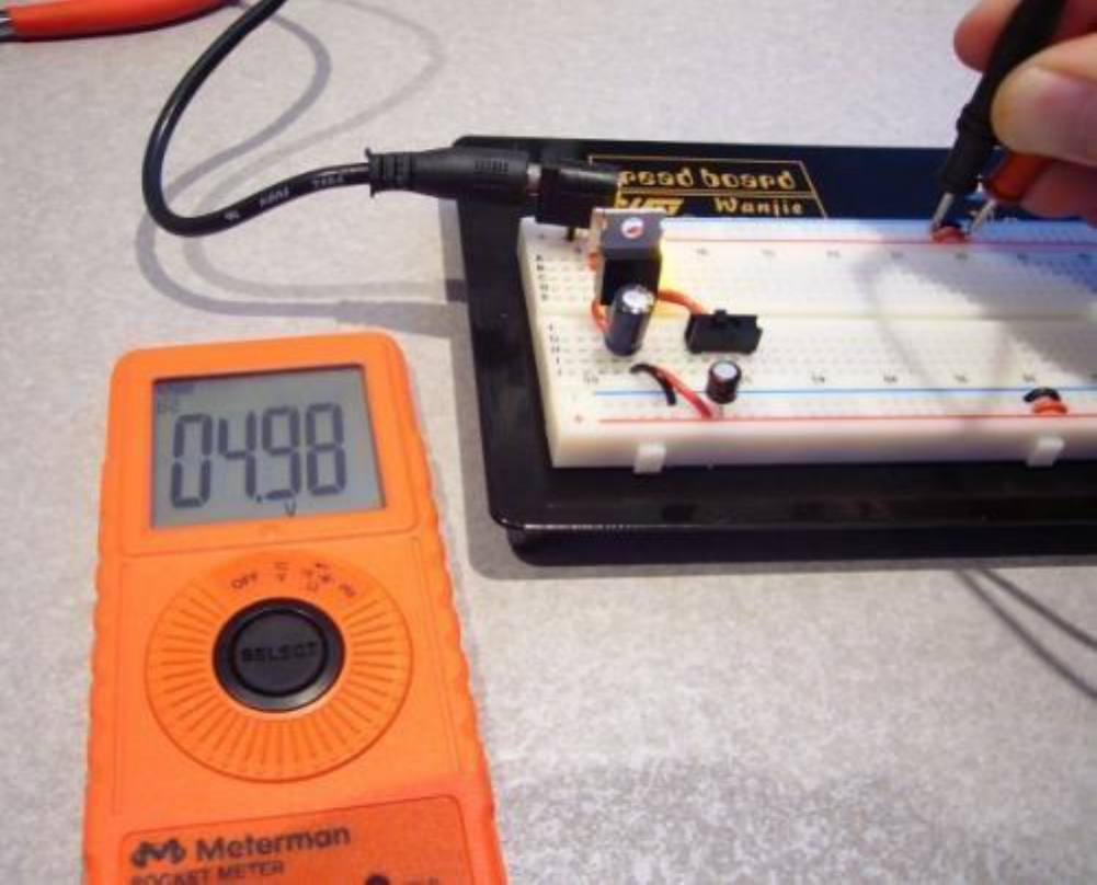 Bu devreyi bradboarda kurup AVO metre ile çıkış gerilimini ölçtüğümüz zaman tam olarak 5.00v gibi bir