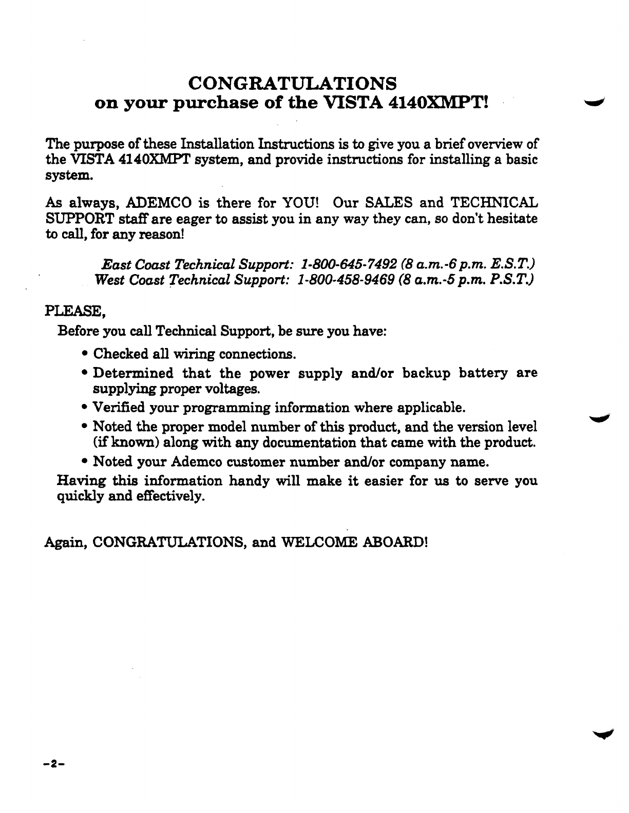As always, ADEMCO is there for YOU! Our SALES and TECHNICAL