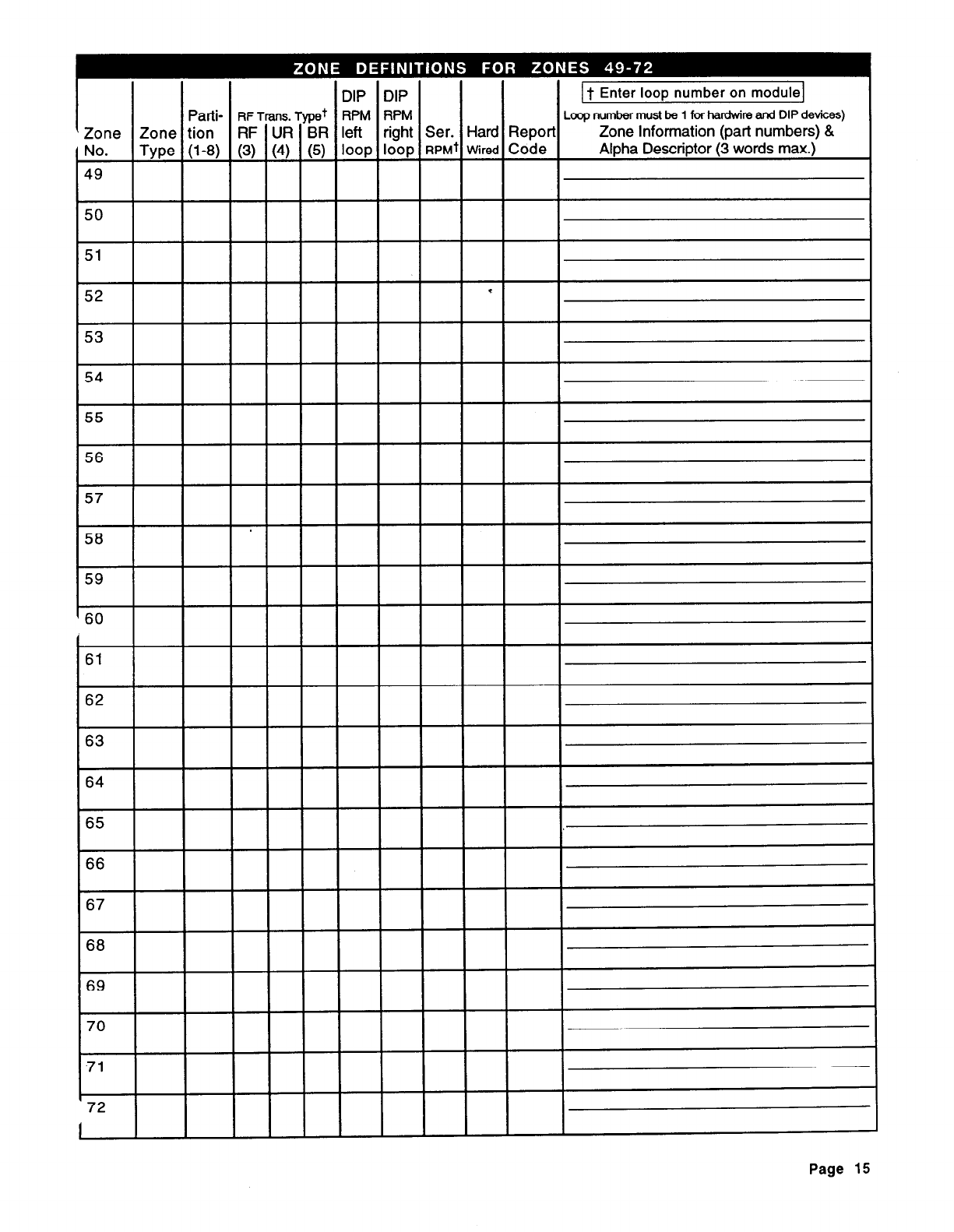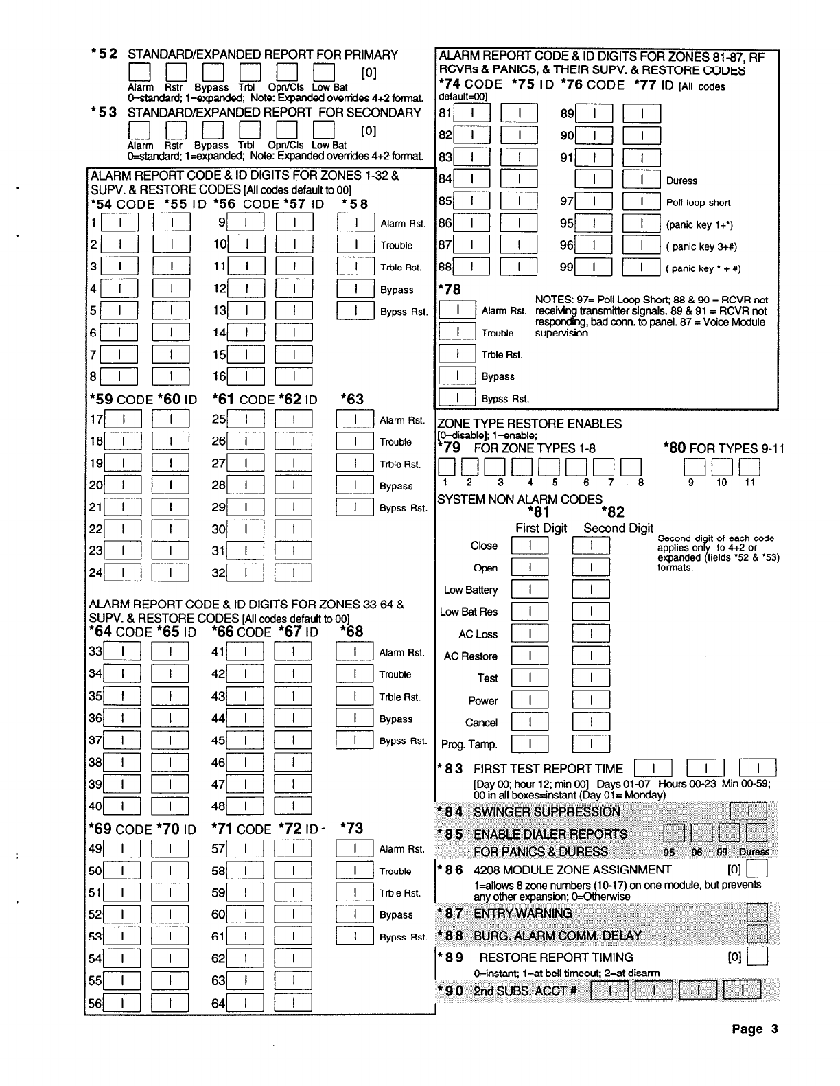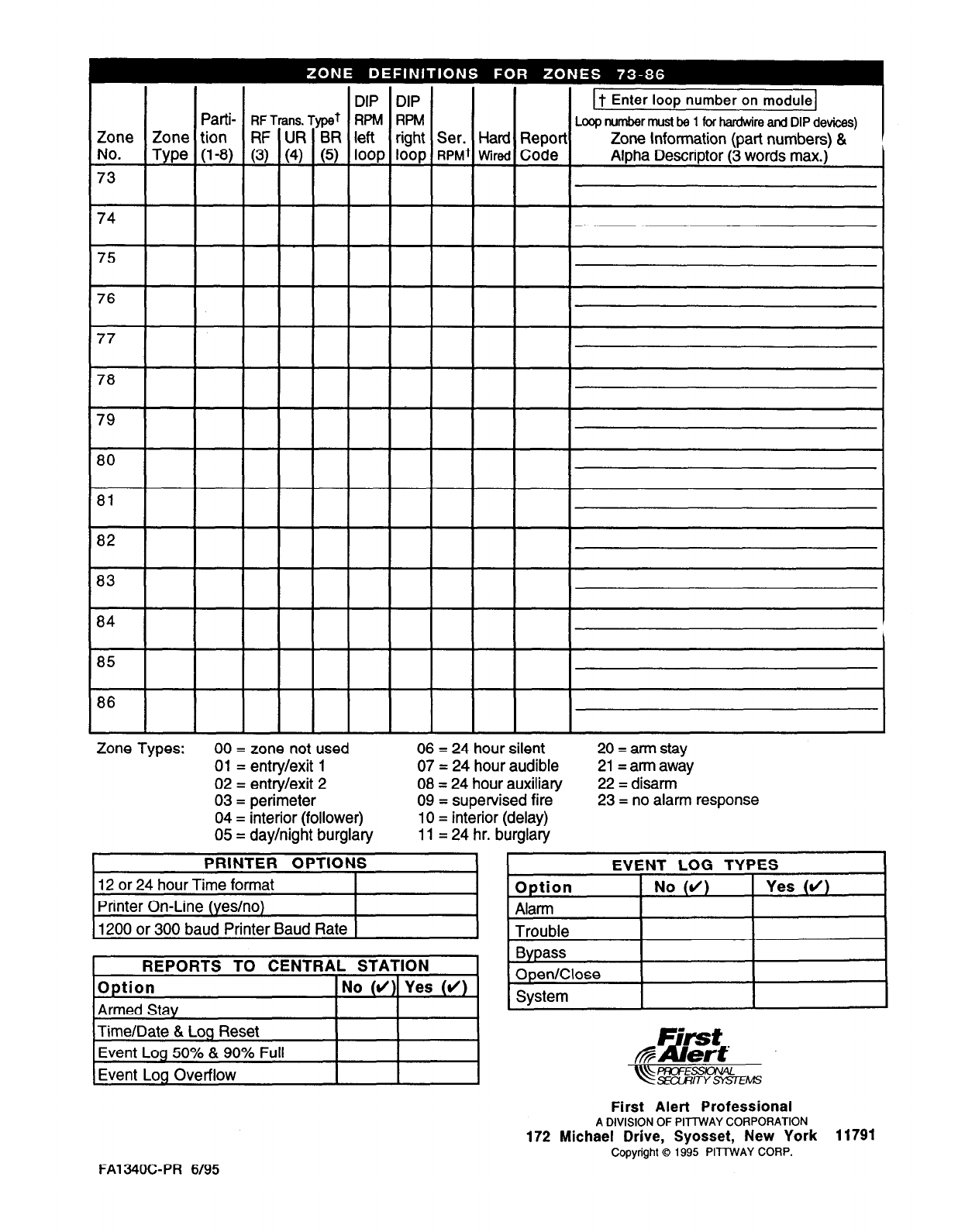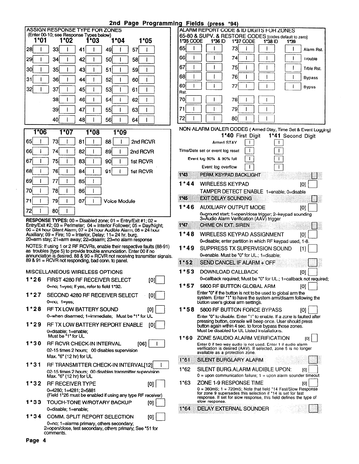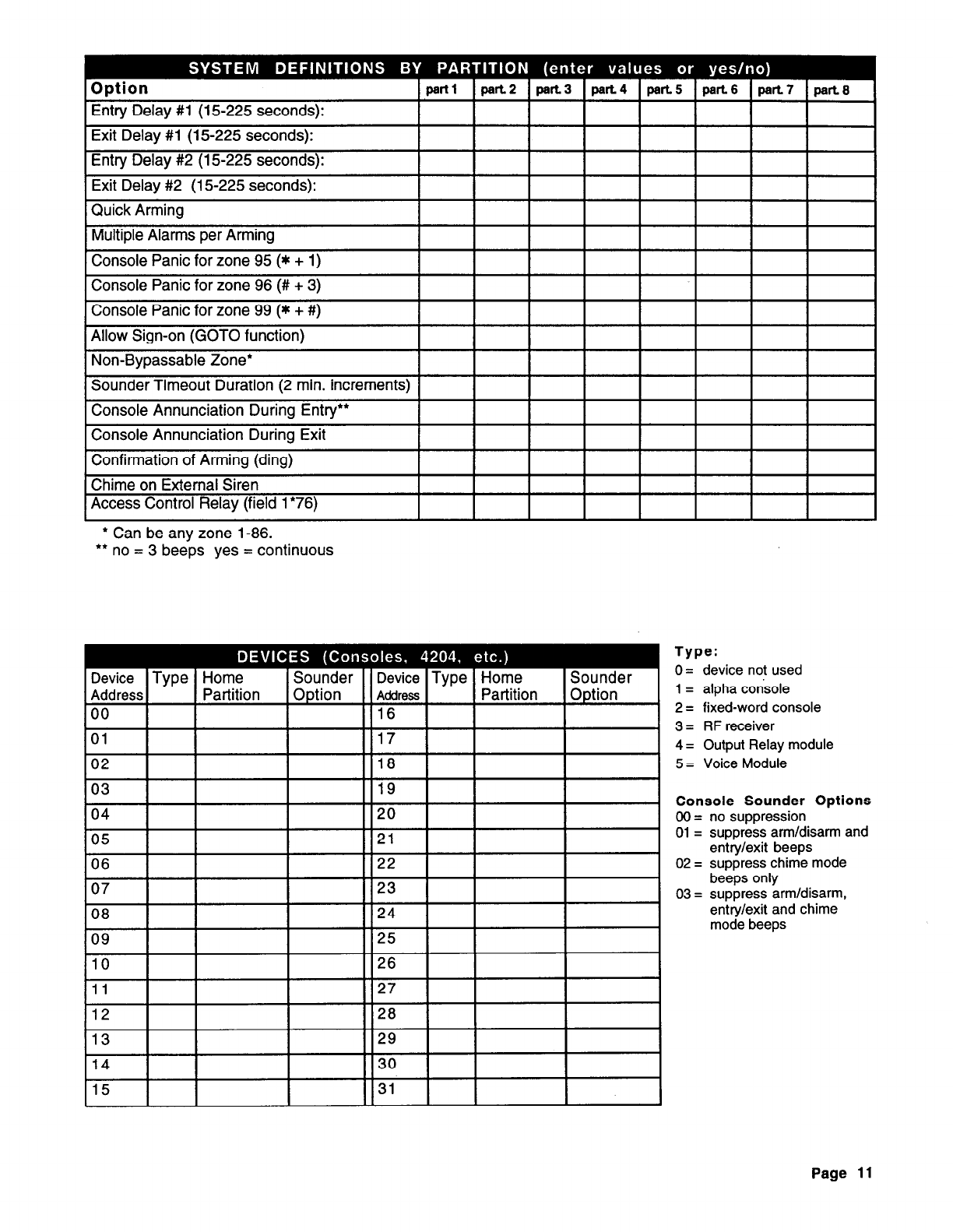 RESPONSE TYPES: 00 = Disabled zone; 01 = Entry/Exit #l;