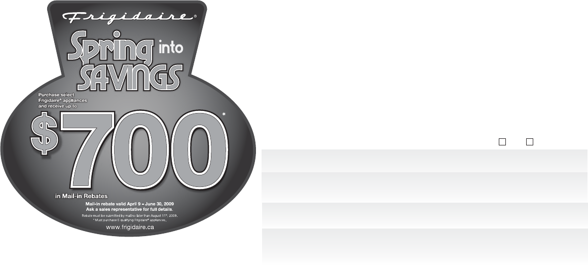 * Based on the purchase of 5 select appliances. Please keep your original sales receipt and a copy of this claim form for your records. Selected Frigidaire models listed on this form must be purchased between April 9 – June 30 , 2009 from a participating authorized Canadian retailer. Only models identied on this claim form are