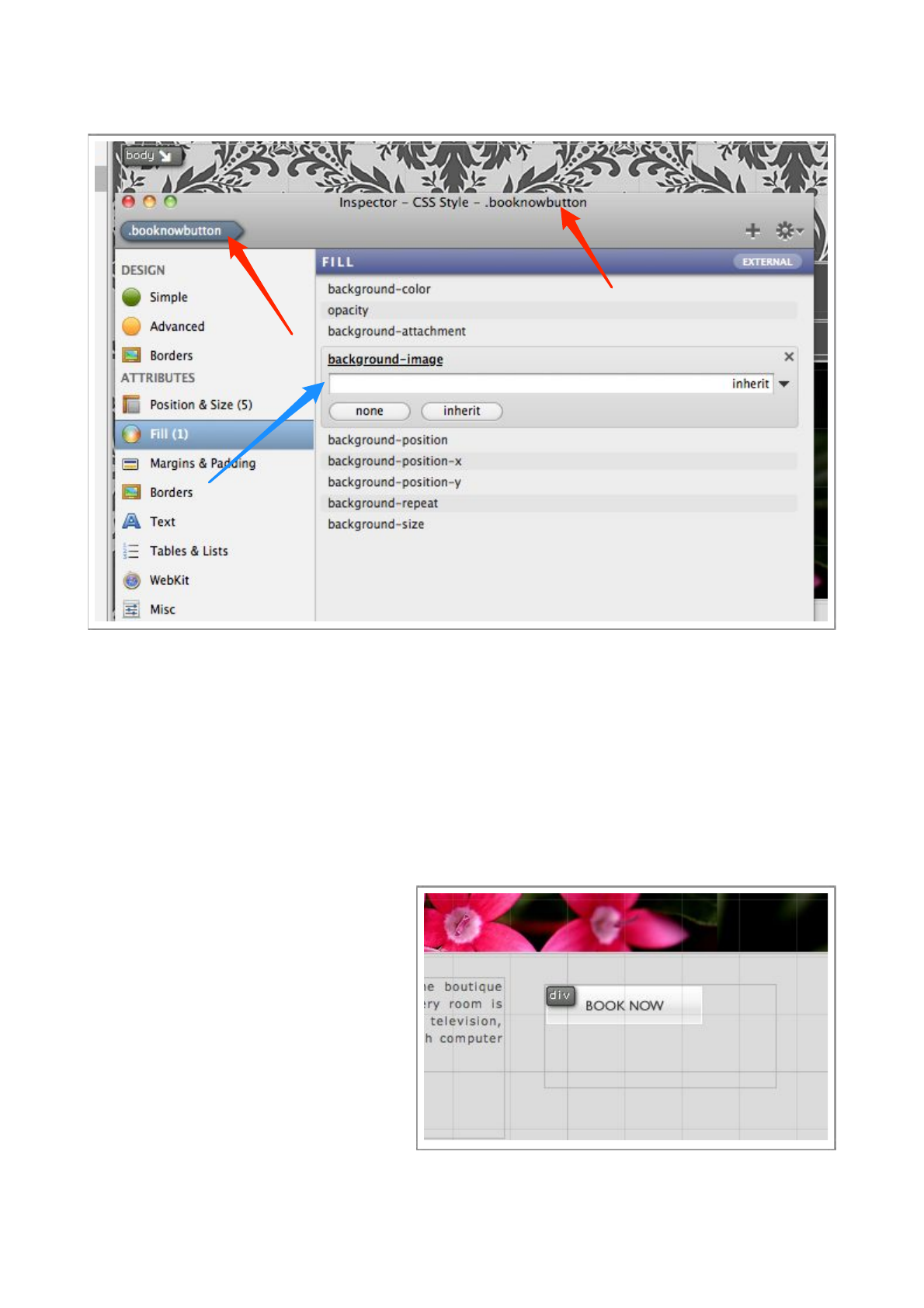Select the ‘.booknowbutton’ style in the Styles List, a n d