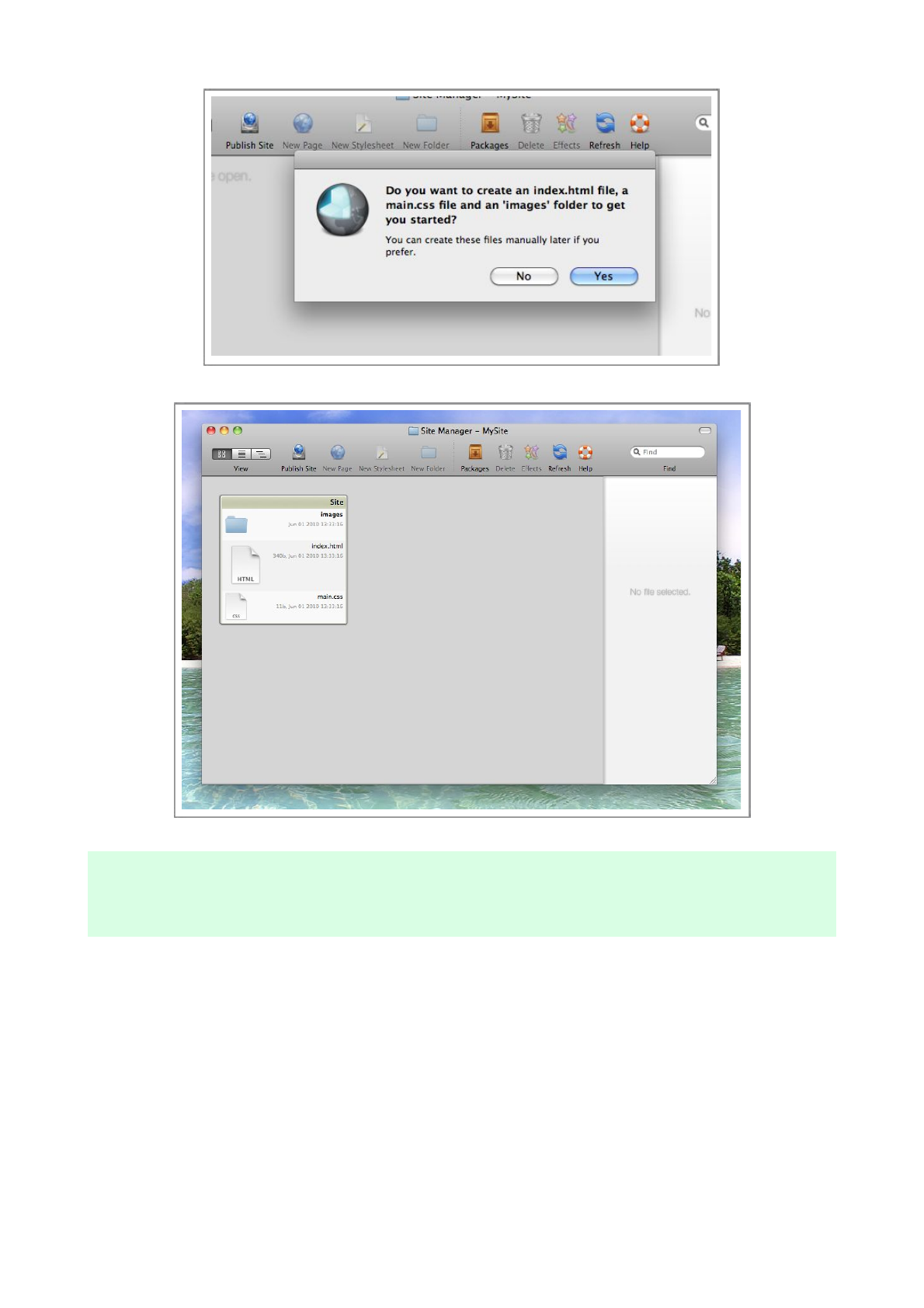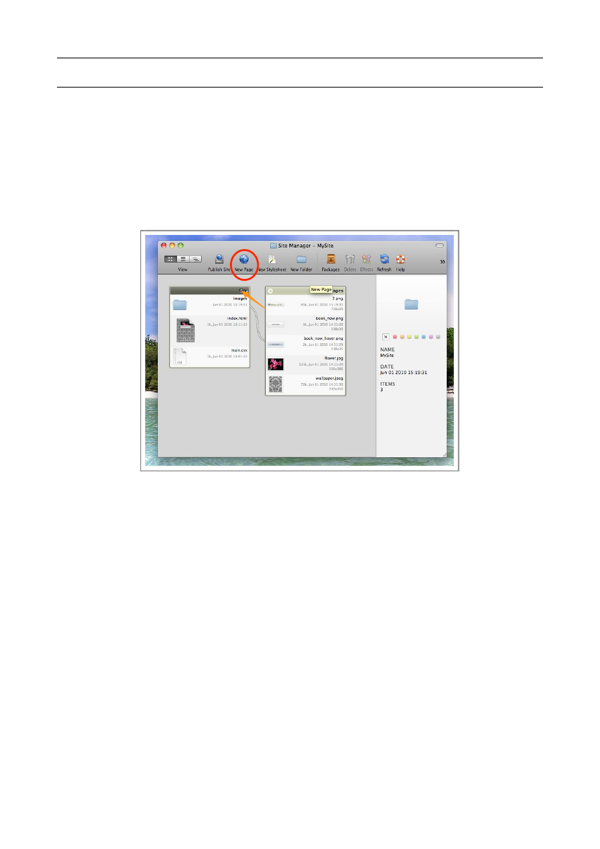 In the Site Manager, sel ect the ‘Si te’ fold e r by cl icki n g o n it’s ti tle , and press th e New Page