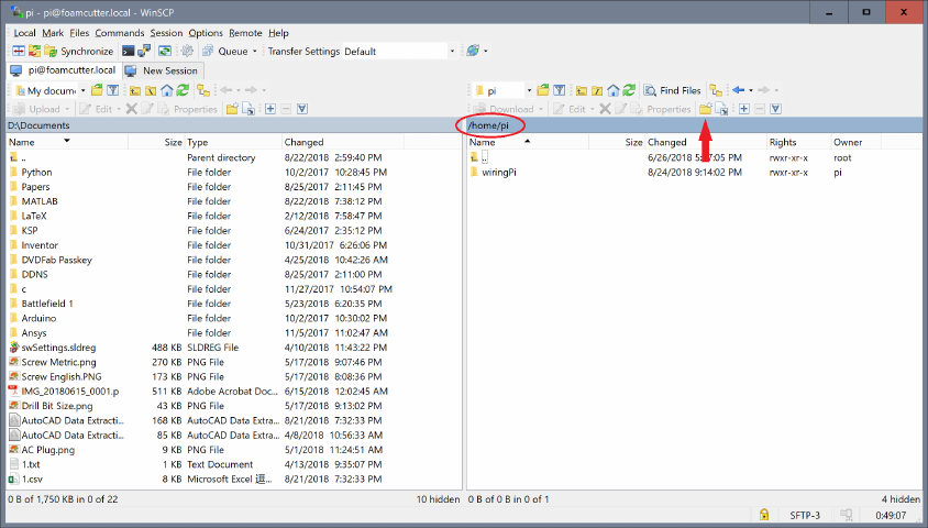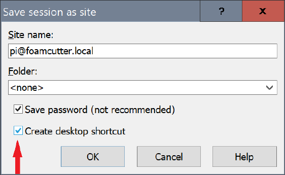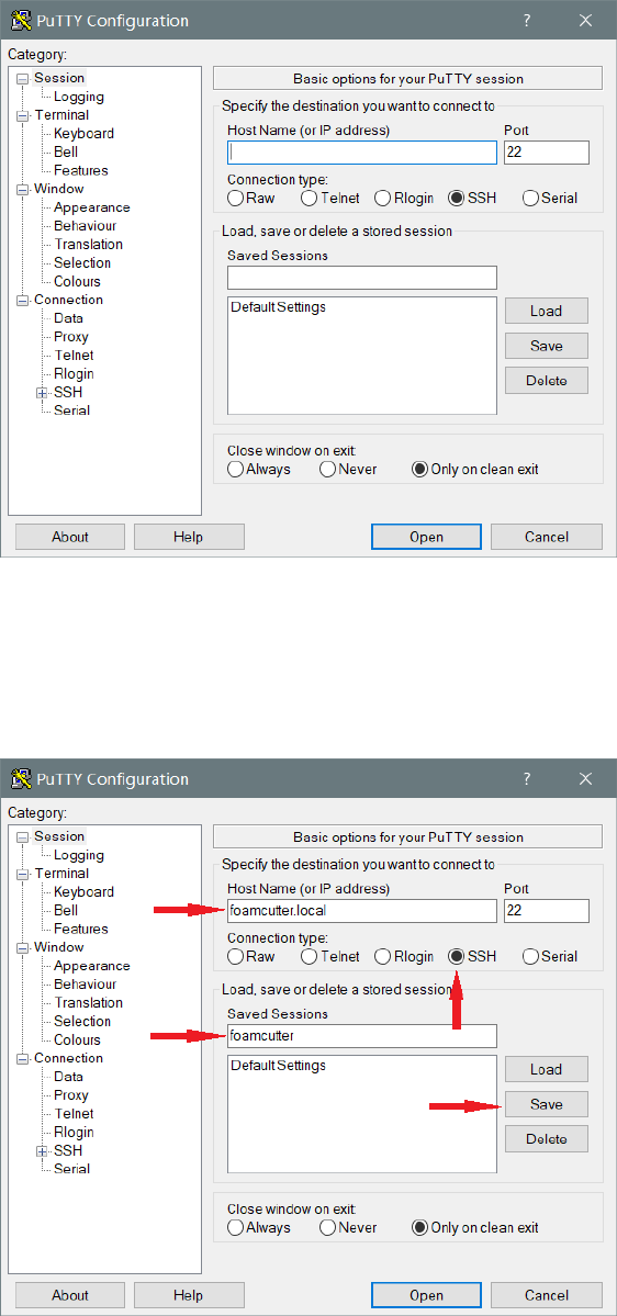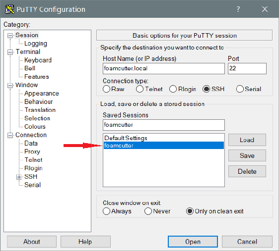 make sure Connection type is SSH. Next, in “Saved Session field”, enter “foamcutter",