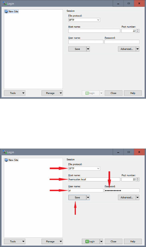 3. As shown in fig 1.5 below, make sure the protocol is “SFTP", then enter “foamcut-