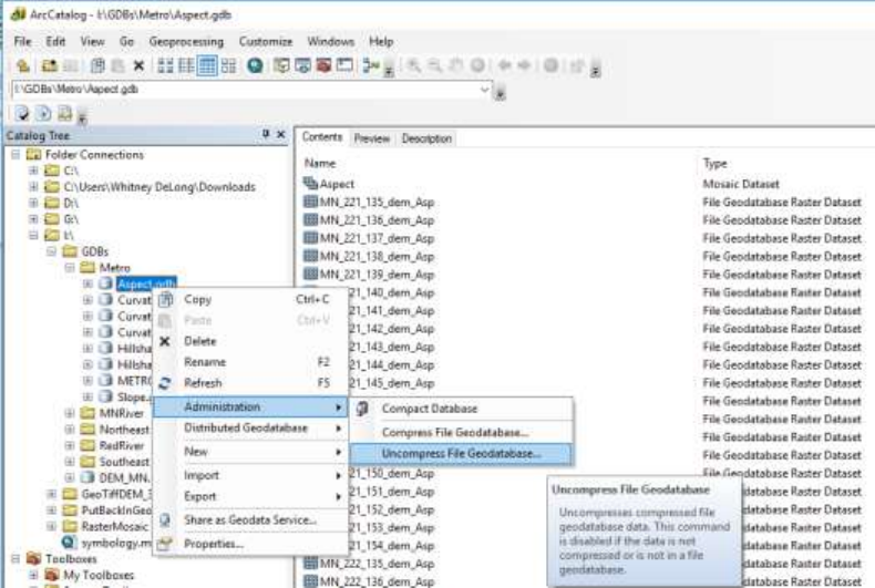 click on each GDB → Administration → Uncompress File Geodatabase (this may