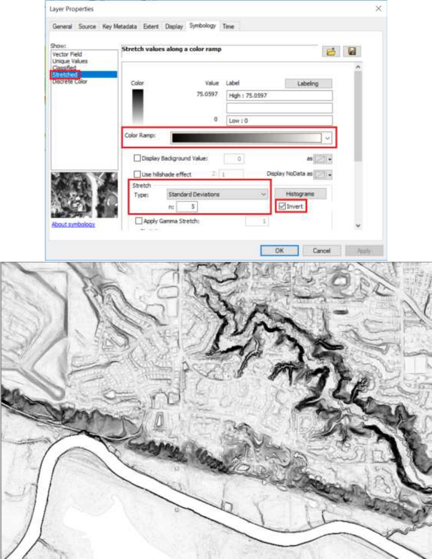 ● Symbolize using the black to white color ramp. Be sure that ridges are white