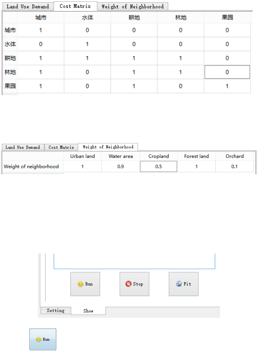 随后需要在 Cost Matrix 选项栏中,设置各类土地利用类型在模拟转换中的